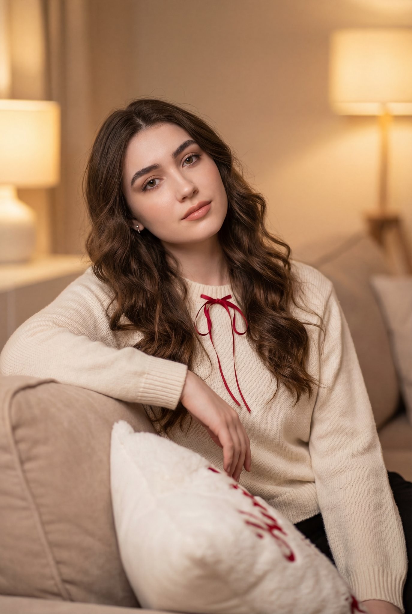 CopyA Ultra-realistic portrait of a young woman sitting on a beige couch in warm ambient indoor lighting, wearing a cream knit sweater with subtle red ribbon detail at the neckline, long wavy brown hair, soft glam makeup, natural lips, defined brows, relaxed confident expression, leaning slightly forward with one arm resting casually, cozy neutral-toned interior background, white plush pillow with red accents in foreground, shallow depth of field, cinematic warm tones, soft shadows, 85mm lens, high detail skin texture, photorealistic, editorial lifestyle photography.