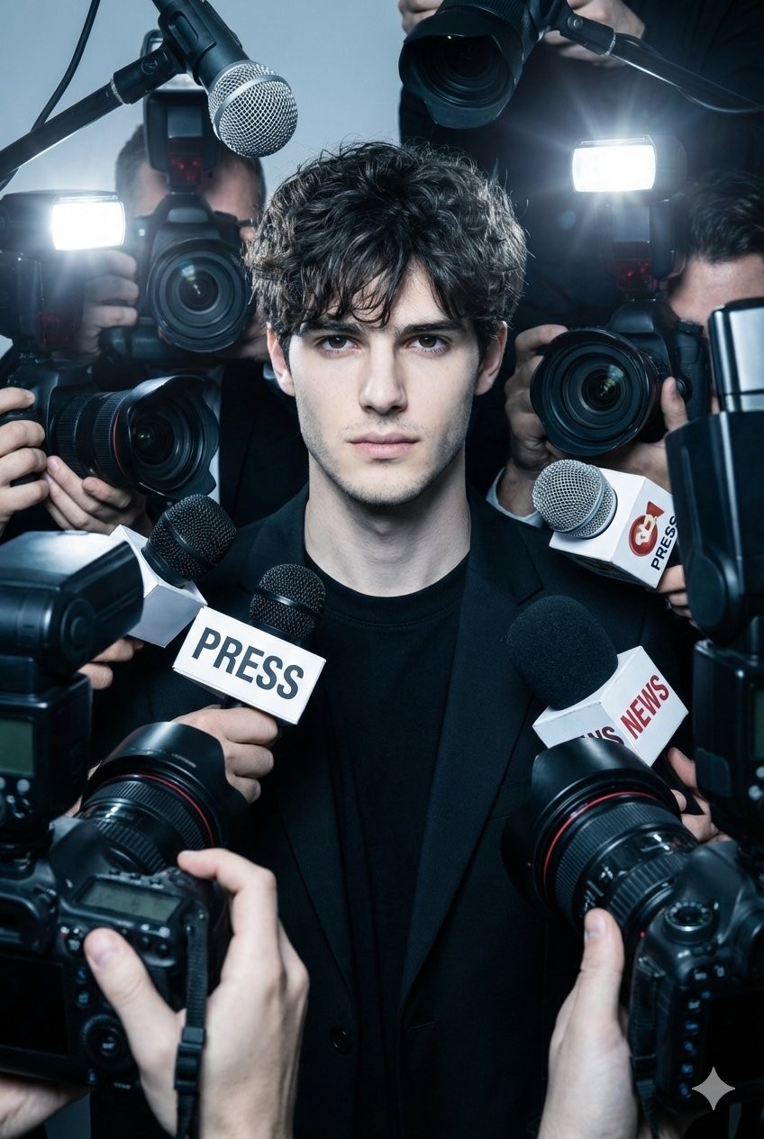 CopyTransform the subject into a high-fashion press scrum photograph, surrounded tightly by cameras, microphones, and boom mics from all directions. Preserve the subject's face, features, and overall identity clearly recognizable. The subject is centered in the frame, partially obscured by overlapping microphones and camera lenses pointing inward, creating a sense of pressure and attention. Expression is calm, controlled, and unreadable - confident but distant. Styling is minimal and fashion-forward: dark clothing, sharp silhouette, sunglasses or statement eyewear optional. The image is shot like a real editorial photograph - direct flash, harsh highlights, deep shadows, and realistic textures on equipment. Colors are cool and neutral, dominated by black, grey, and metallic tones. The composition feels claustrophobic and symmetrical, with the subject visually trapped by media attention. Style: paparazzi press swarm, fashion editorial photography, cinematic realism, high-contrast flash, modern celebrity moment.