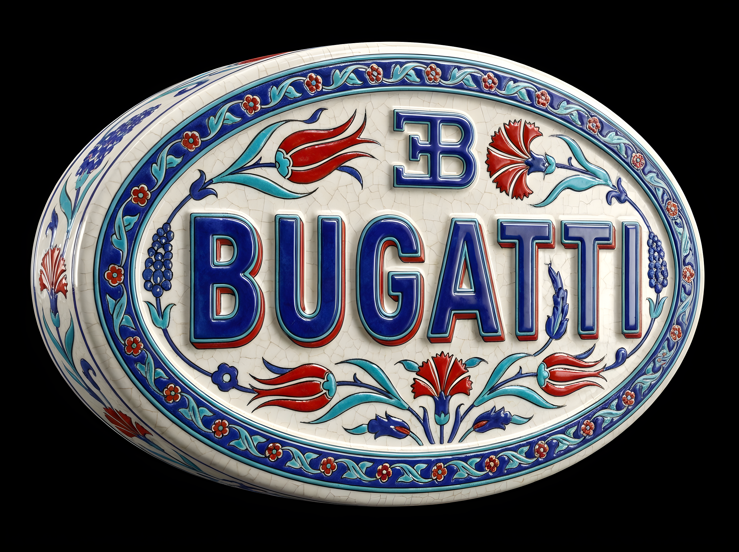 CopyUsing the uploaded image as the exact visual base, transform it into a hyper-realistic 3D object that retains the original shape and proportions of the logo only. Apply traditional Ottoman Iznik ceramic textures—featuring a warm white glazed base with delicate crackle lines, overlaid with vivid cobalt blue, turquoise, and bold red floral motifs such as tulips, carnations, and arabesque vines. The entire logo should be treated as a standalone porcelain sculpture with raised, hand-painted detailing and no background plate or tile structure. Ensure the decorative patterns elegantly follow the contours of the Bugatti logo, without altering its form. Render the object in a pure black background with Cinema 4D-style product lighting—highlighting realistic ceramic gloss, material depth, and subtle reflections. The final result should feel like a luxurious handcrafted ceramic reinterpretation, balancing heritage ornamentation with industrial branding.