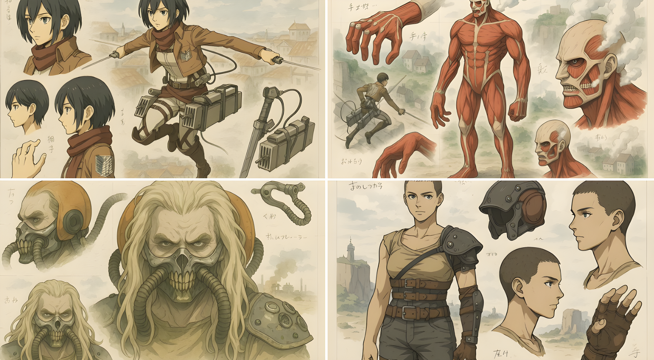 CopyTransform this image into a stylized mechanical design sheet inspired by Japanese anime mecha blueprints. Render the subject with precise, clean linework and semi-realistic cel-shading, as if it were a technical illustration from an anime artbook. Break down the design into parts (e.g. head, hand, accessory, full body) and arrange them like a reference sheet, with different angles and views. Include soft handwritten notes or Japanese characters scattered like concept annotations. Use muted digital colors (red, gray, metallic tones) and draw the background in a loose watercolor anime landscape style — cliffs, cityscapes, or grassland ruins. The final composition should feel like an official design page for an animated sci-fi series or manga. Keep the format horizontal, like a blueprint or character sheet, with a balance between precision and artistic flair.