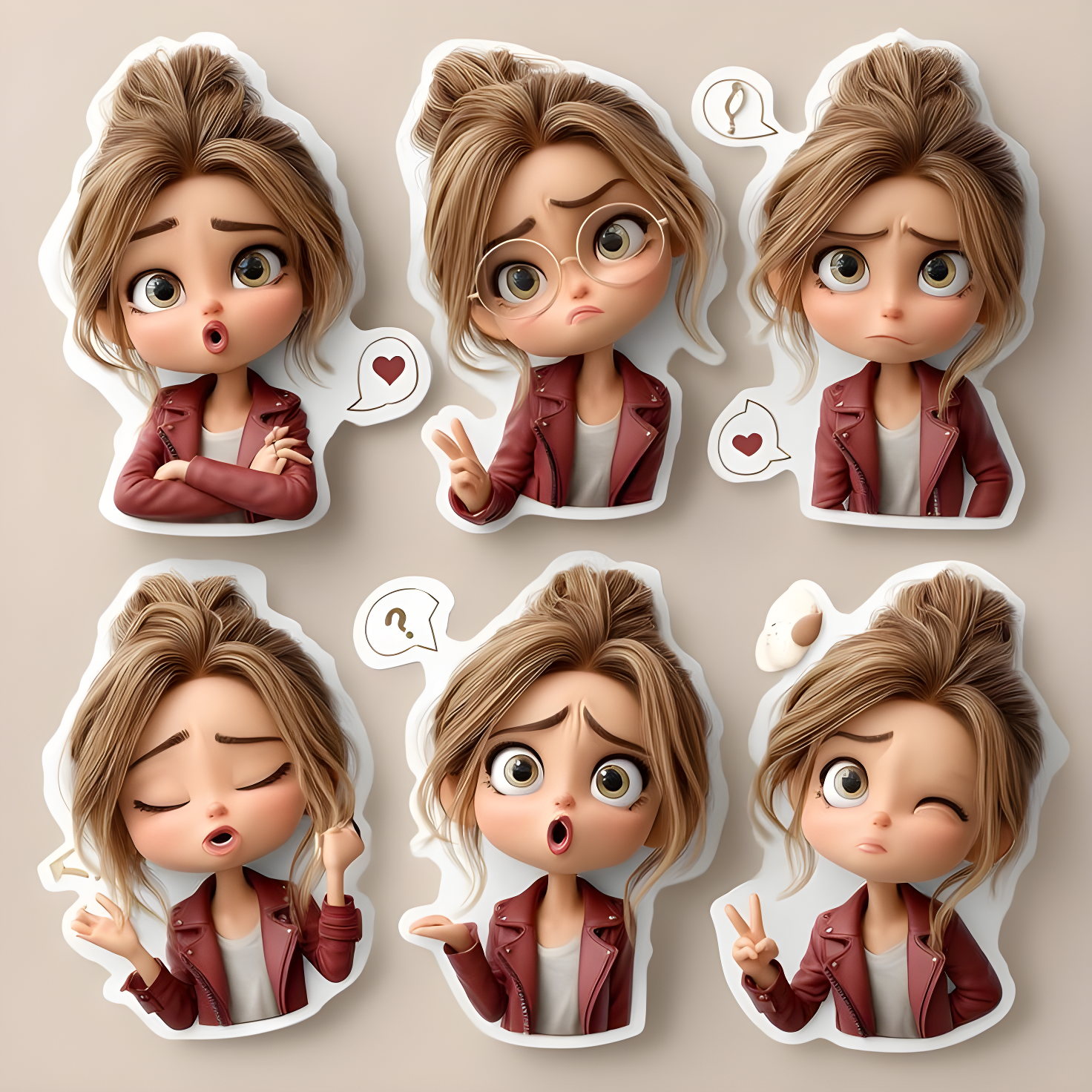 CopyA cute 3D chibi-style cartoon girl sticker set, featuring the same character in multiple emotions and poses. Big expressive glossy eyes, soft rounded face, slightly oversized head, small body proportions. Light brown/blonde messy bun hairstyle with loose strands. Wearing a red leather jacket over a white top. Each pose shows different expressions: surprised, sad, confused, happy, thinking, winking, peace sign, shrugging. Pixar/Disney-inspired 3D render, smooth plastic-like texture, soft lighting, pastel beige background. Sticker-style white outline around each character, clean and minimal aesthetic, high detail, ultra cute, emoji-like expressions, high resolution, studio quality.