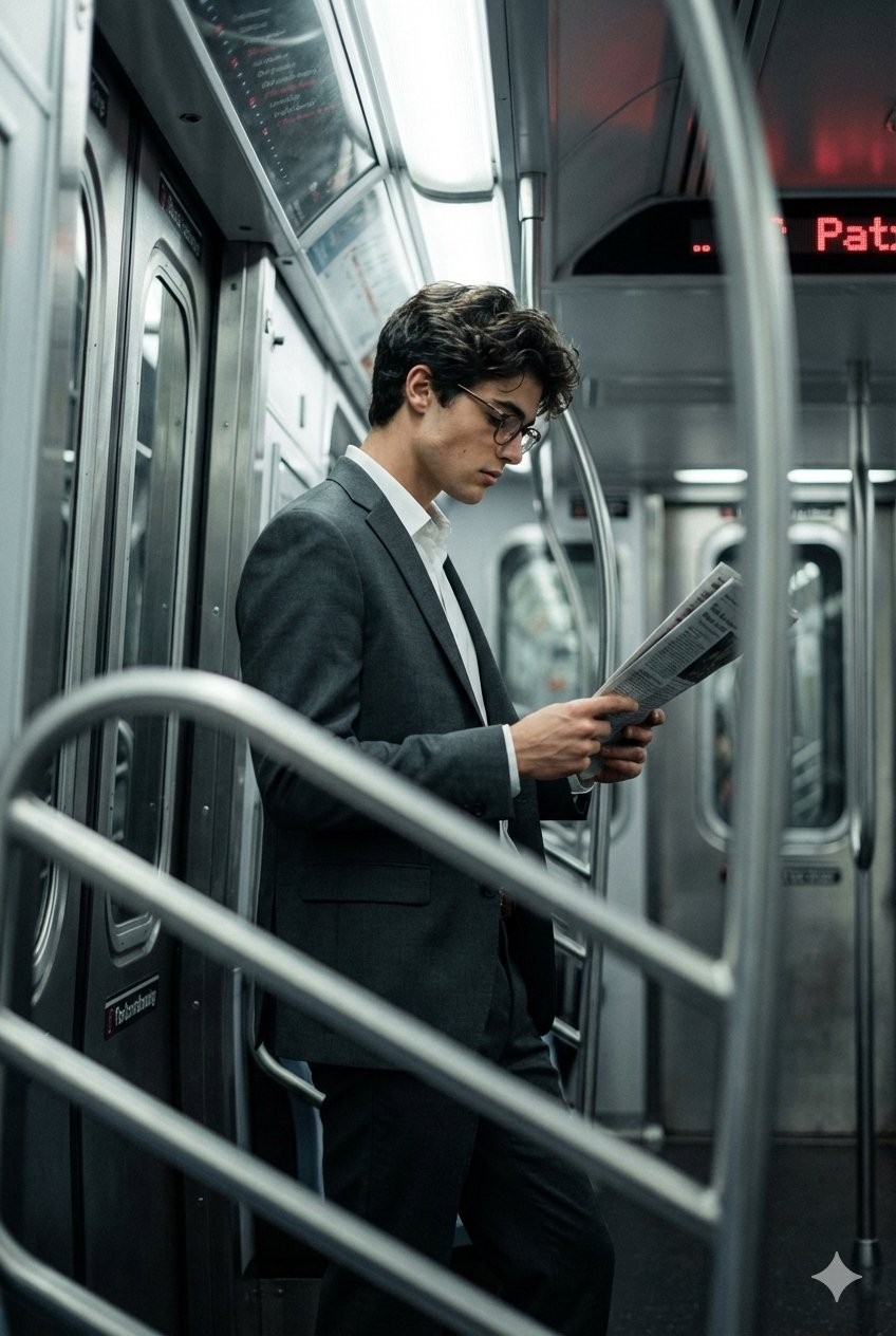 CopyCreate A Cinematic Fashion-editorial Portrait Of A Person Using Their Photo As Identity Reference, Captured As A Candid Full-body To Three-quarter Frame Inside A Modern Subway Or Train Carriage, Subject Standing Near The Doors, Body Slightly Angled, Head Lowered While Reading A Newspaper Or Document Held With Both Hands, Expression Focused, Absorbed, And Introspective, Styling Sharp And Understated With A Tailored Dark Suit, White Shirt, Minimal Accessories Such As Thin-frame Glasses, Clean Urban Professional Aesthetic, Lighting Is Moody Low-key Fluorescent Interior Light From Above And Slightly Behind, Producing Cool Metallic Highlights On Stainless Steel Surfaces, Soft Shadows On The Face, Subtle Specular Reflections On Poles And Walls, No Direct Fill Composition Uses Strong Foreground Framing With Out-of-focus Vertical And Curved Metal Handrails Partially Obscuring The Scene, Creating Depth And A Voyeuristic Cinematic Feel, Background Palette Dominated By Industrial Greys And Silvers With Deep Blacks And A Small Accent Of Muted Red Led Signage, Desaturated Cinematic Color Grading With High Contrast And Controlled Highlights, Lens Simulation Equivalent To A 70-85mm Lens, Moderate Depth Of Field Keeping The Subject Sharp While Foreground Rails And Distant Background Fall Into Soft Blur, Texture Quality Realistic With Fine Film Grain, Matte Fabrics, Brushed Metal Textures, Overall Mood Urban, Quiet, And Contemplative, Evoking Late-night City Commute Editorial Storytelling Editorial, Modern, High-detail, Cinematic Composition, Ultra-realistic Textures, Professional Fashion Photography Style