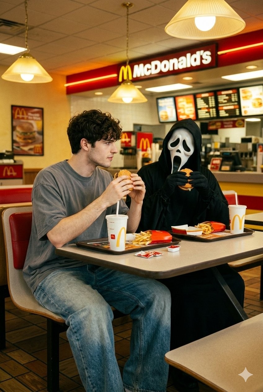 CopyCreate an ultra-realistic image in the horror style of the 90s. The model (man with brown hair, faithful to the provided photo) is sitting next to Ghostface in a McDonald's restaurant with a classic 90s look. Both are eating hamburgers, illuminated by soft, warm lighting in a nostalgic, retro atmosphere. Model's outfit: gray oversized T-shirt and faded wide jeans. Aesthetics: subtle film grain, cinematic tone, strong realism, and nostalgic charm. Background: slightly blurred McDonald's interior with warm tones and ambient light that evokes the 1990s era. Don't change the face. (Use the attached image)