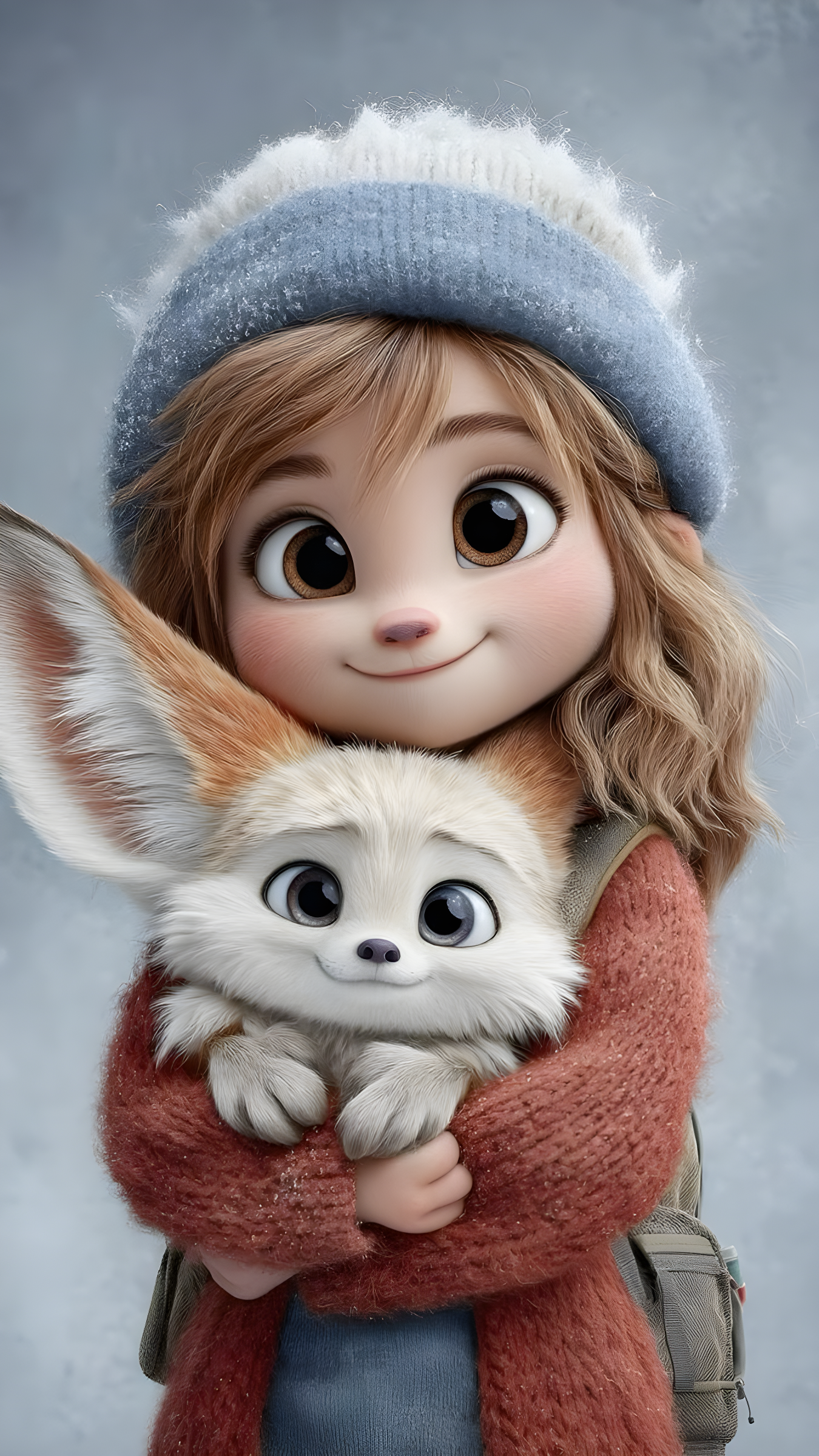 CopyA heartwarming 3D animated illustration in a soft Pixar/Disney-inspired style. A cute young girl with oversized expressive eyes, soft blush cheeks, and delicate facial features. She wears cozy autumn clothing — an oversized knitted sweater/hoodie in muted earthy tones, warm trousers, and casual sneakers. Her hair is slightly messy and fluffy, giving a gentle, innocent look. She is accompanied by an adorable small fox with big glossy eyes, fluffy fur, and oversized ears, either being lovingly held or standing closely by her side. Soft studio lighting, pastel background with warm beige/gray tones, shallow depth of field, ultra-detailed textures (knit fabric, fur strands), smooth cinematic render, wholesome and cozy mood, magical realism, 8K quality, ultra-cute aesthetic, storybook charm.