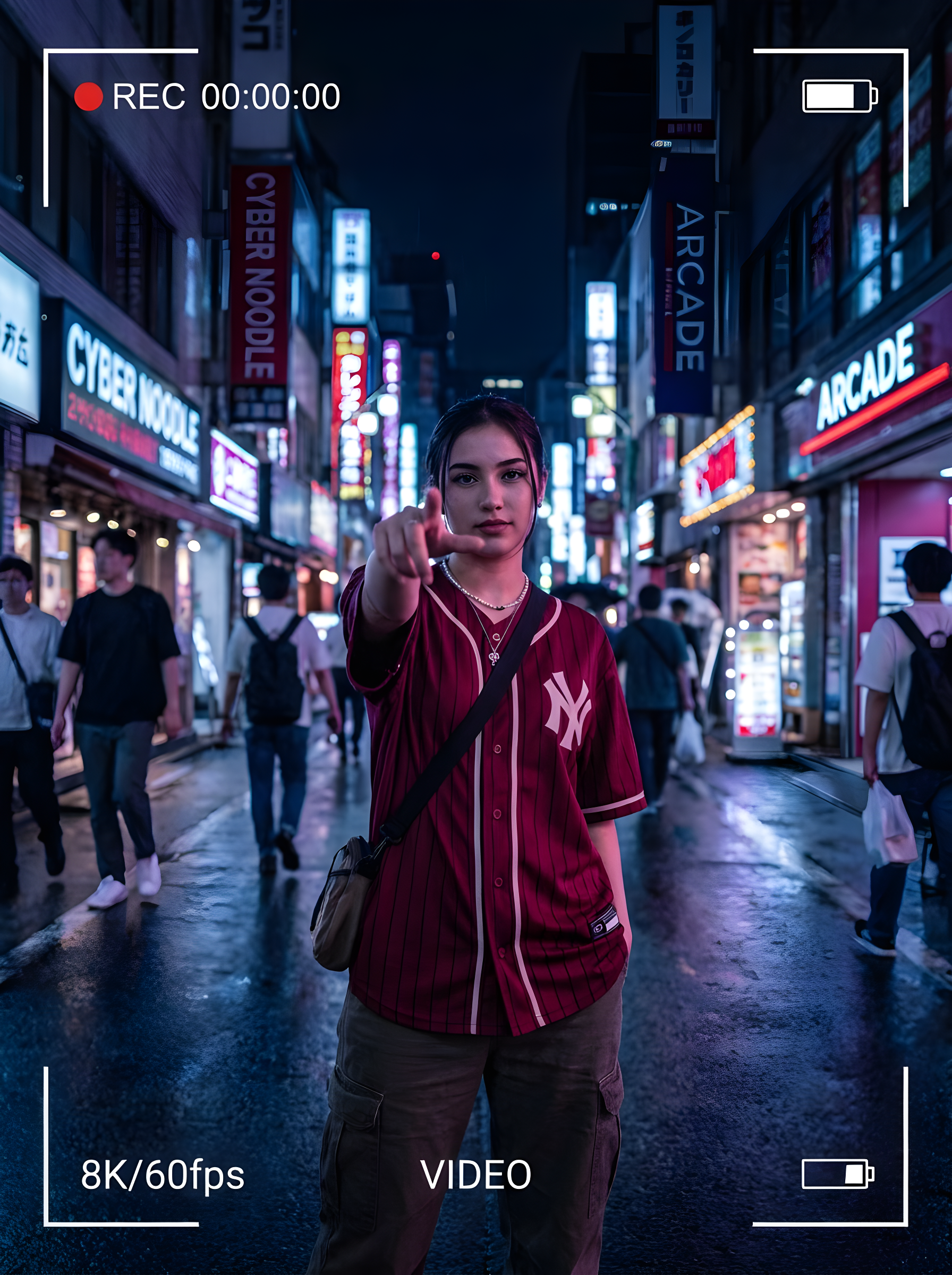 Copy{ "request_id": "portrait_neon_urban_001", "configuration": { "model": "v6. 0_or_latest", "output_settings": { "dimensions": { "width": 1080, "height": 1920, "aspect_ratio": "9:16", "target_resolution": "64K DSLR" } } }, "scene_composition": { "subject": { "entity": "Young woman", "pose": "Standing confidently", "action": "Extending index finger forward toward camera lens", "interaction": "Dynamic gesture / POV interaction", "wardrobe": { "outerwear": "dark crimson red striped baseball-style shirt", "undergarment": "Light inner shirt", "bottoms": "Cargo pants", "accessories": [ "Necklace", "Crossbody bag" ] } }, "environment": { "location": "Urban street", "time_of_day": "Night", "ambience": "Neon-lit", "background_elements": [ "Colorful city lights", "Blurred passersby" ] }, "cinematography": { "camera": { "perspective": "Wide-angle", "depth_of_field": "Soft bokeh", "motion": "Slight motion blur" }, "lighting": { "style": "Cinematic", "primary_sources": [cyber punk street lights", "City glow"] }, "ui_overlay": { "enabled": true, "aesthetic": "Smartphone video recording", "on_screen_elements": [ "REC 00:00:00", "8K/60fps", "Frame brackets", "VIDEO indicator", "CINEMATIC indicator" ] } } }, "technical_rendering": { "style": "Hyper-realistic", "engines": [ "Octane Render", "Unreal Engine 5" ] }, "negative_prompt": { "stylistic_exclusions": [ "cartoon", "illustration", "anime" ], "quality_exclusions": [ "low quality", "pixelated", "blurry" ], "anatomical_exclusions": [ "bad anatomy", "deformed hands", "extra fingers", "missing limbs", "bad proportions" ], "branding_exclusions": [ "watermark (except for requested UI overlays)" ] } }