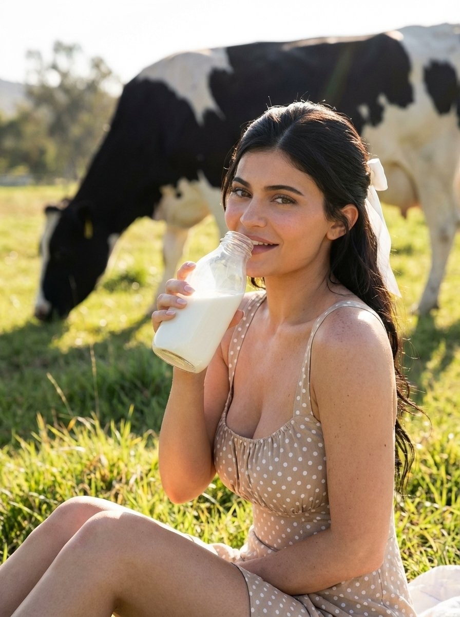 Copy{ "image_generation_prompt": { "subject": { "description": "Young woman sitting in a sunlit countryside field drinking milk from a glass bottle", "pose": { "body_position": "sitting on the ground in a relaxed leaning pose", "head_position": "tilted slightly back while drinking", "arms": "one hand holding a glass milk bottle near lips, other arm extended behind for support", "expression": "eyes gently closed or relaxed while drinking" } }, "hair": { "style": "long brunette hair tied into a low side ponytail with a white ribbon", "details": "soft natural strands, slight movement from breeze" }, "clothing": { "outfit": "light beige dress with black polka dots", "fit": "flowy feminine fit with soft fabric folds" }, "environment": { "setting": "open countryside field", "background": "large black and white cow standing behind subject, grassy field with wildflowers, blue sky with soft clouds", "props": "glass milk bottle with slight milk spill detail" }, "lighting": { "type": "natural sunlight", "style": "bright midday rural sunlight" }, "camera": { "lens": "50mm", "angle": "slightly low angle, close to ground perspective", "focus": "sharp focus on subject, slightly blurred background" }, "quality": { "resolution": "high", "rendering": "ultra photorealistic" } } }