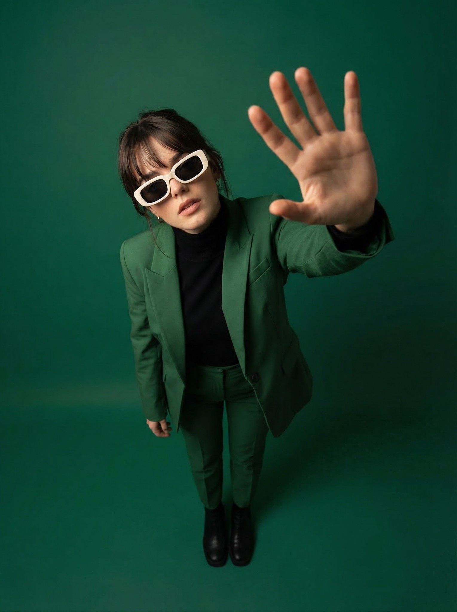 CopyA high-angle, full-body shot of a stylish woman use image for face reference standing against a solid deep emerald green backdrop. She is wearing a sharp, tailored forest green suit over a black turtleneck and black boots. She sports chunky white-framed rectangular sunglasses and is looking directly upward into the camera. Her hand is reaching out toward the lens in a "touching the screen" gesture, creating a forced perspective effect. The lighting is cinematic with soft shadows, giving the scene a minimalist, high-fashion editorial look with a retro-modern vibe.