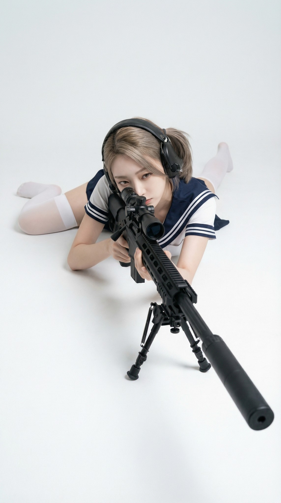Copy{ "portrait_prompt": { "subject": { "description": "Based on <User Portrait>, an adult female cosplay model with short dark brown hair tied into low tails, wearing large black tactical earmuffs, lying low on a seamless white studio floor while aiming a long black suppressed precision rifle prop with a bipod directly toward the camera, with a focused and calm expression.", "features": { "hair": "short dark brown hair, soft bangs, low tied tails", "eyes": "partially obscured by downward gaze, focused on the rifle sightline", "expression": "calm, concentrated, restrained" }, "pose": "prone low shooting pose, torso close to the floor, elbows supporting the rifle, legs folded upward behind the body" }, "attire": { "type": "Based on user-uploaded clothing reference", "details": [ "navy-and-white sailor-inspired long-sleeve cosplay top", "white thigh-high stockings", "black tactical earmuff headset", "clean anime-cosplay styling with minimal accessories" ], "color": "navy blue, white, and black" }, "composition": { "shot_type": "Full body", "focal_length": "35-50mm", "aperture": "f/5.6", "camera_angle": "high angle", "camera_height": "above head", "framing": "centered composition with the rifle barrel forming a strong leading line from the foreground straight into the subject; large clean negative space on a seamless white background; body placed slightly above center with the weapon dominating the vertical axis", "aspect_ratio": "9:16" }, "lighting": { "type": "high-key diffused studio lighting", "direction": "soft overhead-front light with broad fill, nearly shadowless", "mood": "clean, controlled, restrained" }, "color_palette": { "film_simulation": "Fujifilm PRO Neg Hi inspired color grading", "style": "clean commercial editorial cosplay palette with restrained saturation and neutral whites", "tones": [ "clean bright whites", "navy blue accent", "soft pale skin tones", "deep matte black rifle details" ], "grade_notes": [ "highlight roll-off: bright white background with soft edge retention around the subject", "shadow tint: neutral to slightly cool", "contrast curve: moderate clean contrast with controlled blacks and soft skin separation", "grain: minimal to none, polished digital finish" ] }, "environment": { "setting": "seamless white cyclorama studio", "background": "pure white minimal background with almost no visible texture", "atmosphere": "sterile, airy, high-key negative space" }, "mood": "focused, minimal, composed, slightly surreal, cosplay-editorial", "technical_tags": [ "photorealistic", "clean studio capture", "high-key lighting", "editorial cosplay photography", "sharp prop detail", "subtle bloom", "minimal background" ], "character_reference": "Based on user-uploaded character reference", "clothing_reference": "Based on user-uploaded clothing reference", "negative_prompt": "underage appearance, broken anatomy, extra fingers, deformed hands, warped rifle barrel, bent bipod, mismatched weapon scale, inconsistent perspective, awkward crop, flat generic composition, random shallow depth of field, plastic skin, over-processed HDR, harsh direct flash shadows, messy background, muddy whites, incorrect stocking texture, floating limbs, unnatural leg proportions" } }