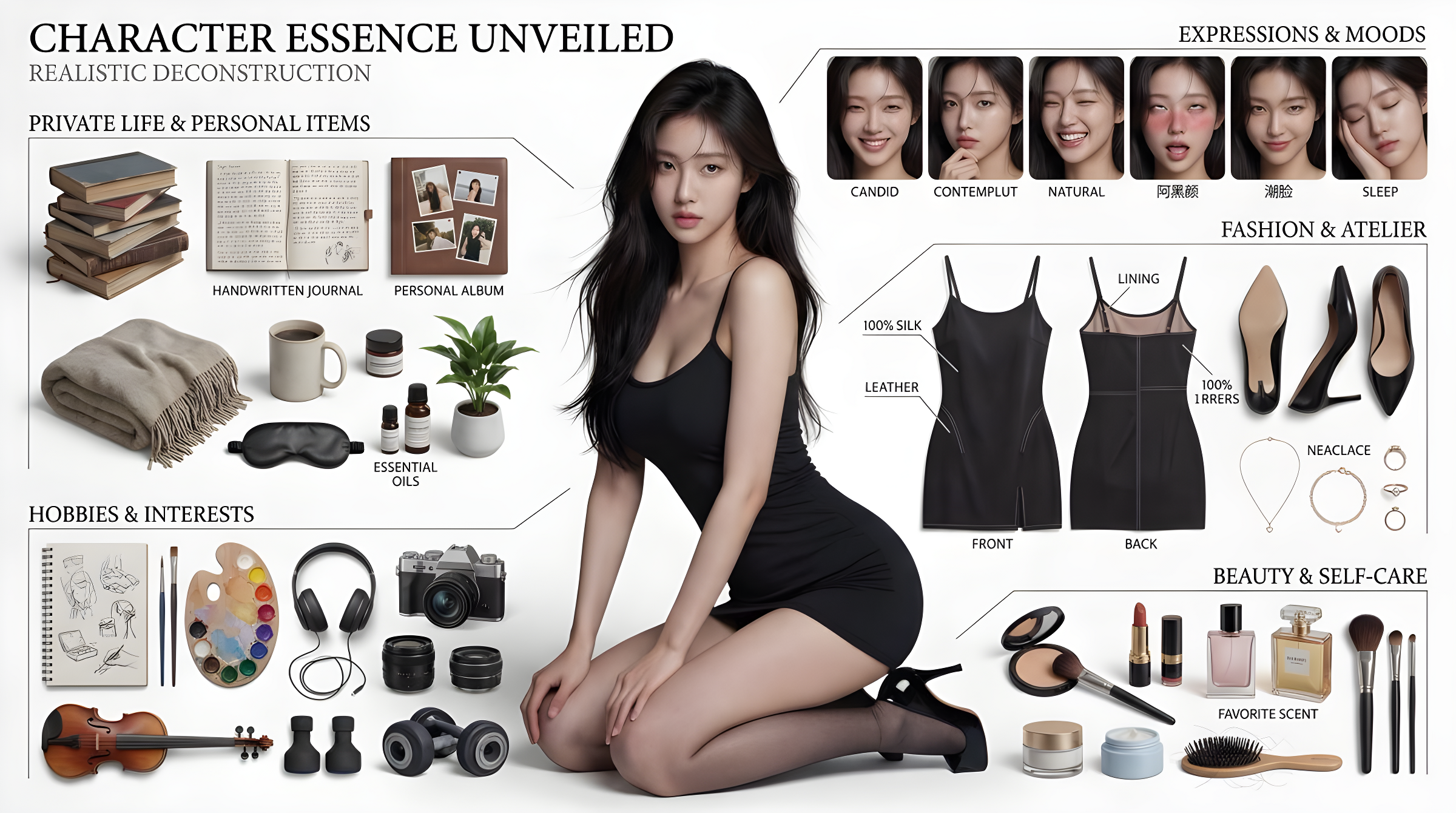 Copy3D Realistic Deconstruction Prompt. Based on reference image, create an ultra-high-quality, cinematic 3D realistic deconstruction art poster that emphasizes authentic human presence and photographic realism. Transform the photographed individual into a lifelike 3D character with true-to-life anatomy, skin texture, emotional nuance, and natural lighting. Arrange personal belongings using Knolling (orthogonal alignment) artistic layout. Aspect Ratio: 16:9 landscape. Artistic Style Core: Photorealistic Humanism — grounded in anatomical accuracy, natural subsurface scattering, visible pores, fine body hair, sweat sheen, and emotionally resonant realism. Quality Benchmark: Visually indistinguishable from high-end editorial photography. Total Items: 30–36 pieces arranged at precise 90-degree angles around the central figure. Categories include Fashion & Attire, Beauty & Self-Care, Intimate Private Life, Emotional Expression Gallery, Body Posture & Movement.