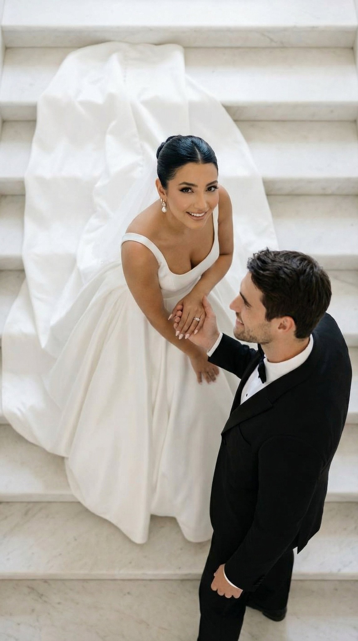 Copy{ "generation_request": { "output": { "aspect_ratio": "4:5", "resolution": "ultra_high", "sharpness": "filmic_crisp", "grain": "subtle_35mm_film" }, "scene": { "environment": "white marble staircase, clean minimal background", "lighting": "soft directional daylight with gentle shadows across steps", "mood": "elegant, intimate, editorial wedding moment" }, "subjects": { "bride": { "wardrobe": "white wedding gown with long flowing train, clean satin/crepe texture", "pose": "seated or kneeling on the steps with one arm reaching down", "expression": "warm smile, joyful", "hair": "sleek updo (as in reference)" }, "groom": { "wardrobe": "black tuxedo or black suit with white shirt", "pose": "standing at lower part of stairs reaching upward" } }, "camera": { "angle": "true top-down overhead", "lens": "35mm", "aperture": "f/2.8" }, "style": { "aesthetic": "high-end wedding editorial, cinematic realism" } } }