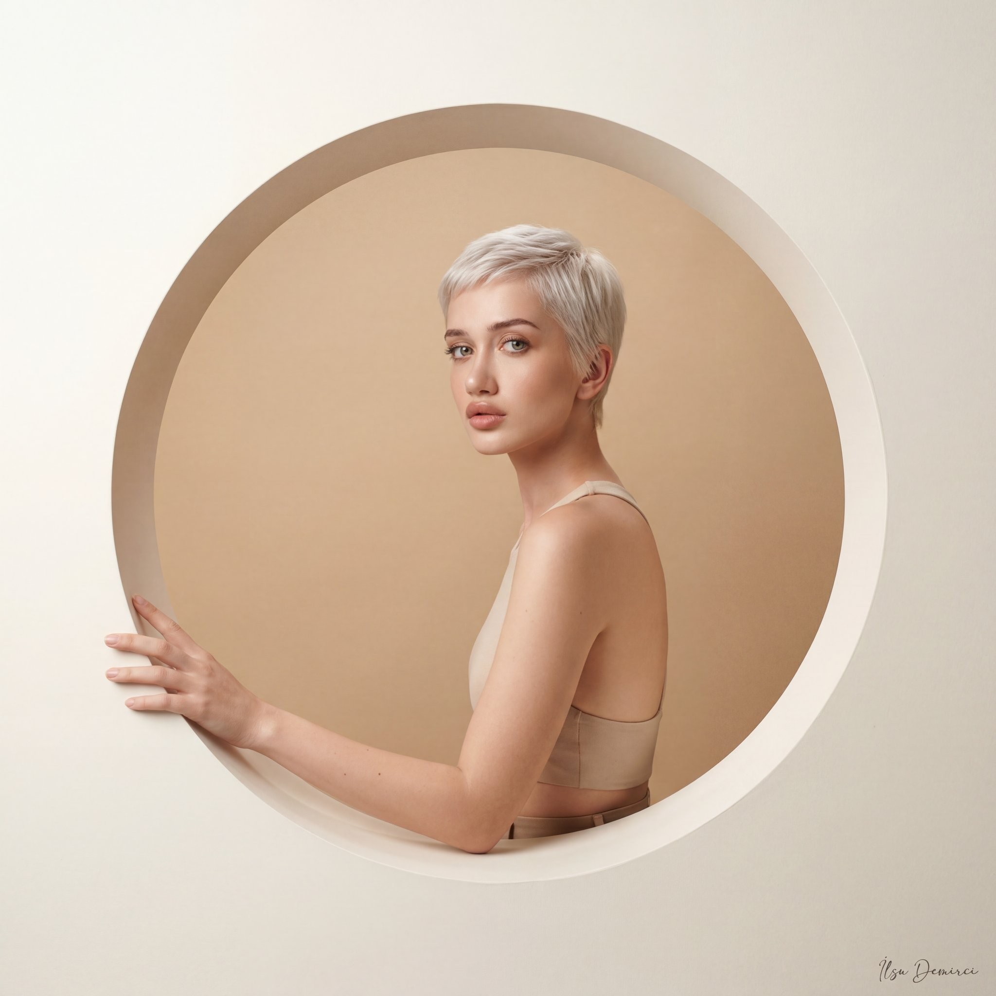 CopyA high-end studio portrait of a poised young adult model with short platinum-blonde hair and minimalist fashion in neutral tones, interacting with a large circular cutout centered within a thick matte cream-white wall. The wall shows realistic 3D depth (around 8 cm) with soft rounded inner edges and smooth shadow falloff. Inside the circular opening, a clean warm beige backdrop contrasts with the wall, clearly separating the inner and outer spaces. The model leans gently into the circular edge, resting one hand on the rim with calm confidence. Lighting: balanced studio setup — soft diffused key from front-left and mild fill from right, creating gentle highlights and subtle shadow along the rim to define depth and separation between wall and background. Camera: straight-on, centered composition, 3:4 vertical portrait framing. Ultra-detailed 8K studio photography with sharp focus and natural tonal depth. Mood: modern minimal. No text, watermark, or extra props beyond the wall, circular cutout, and model. Add a subtle handwritten text in the bottom-right corner that reads