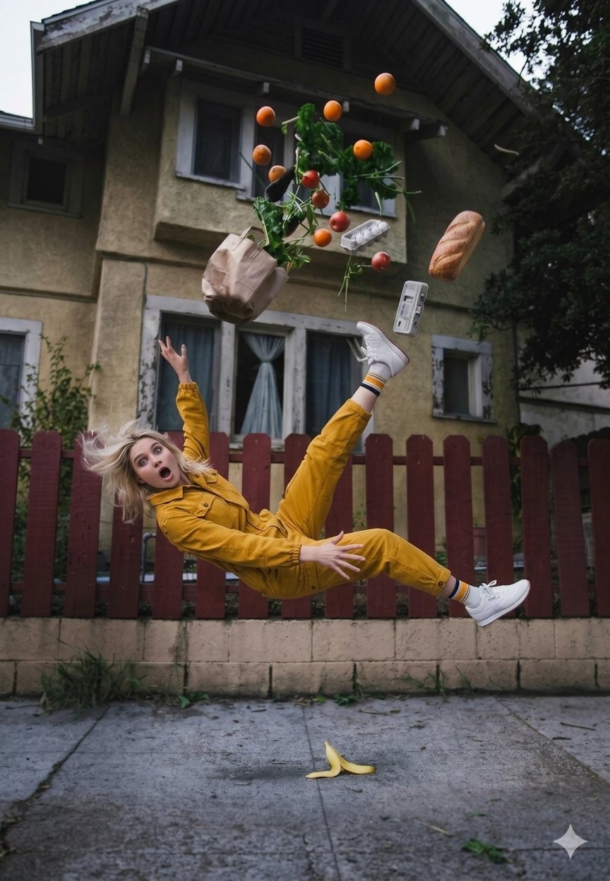 Copy{ "style": "cinematic realism, surreal moment frozen in time", "scene": "a suburban street in front of an old slightly worn house with muted yellow walls, white window frames, and a red wooden fence, overcast daylight with soft diffused lighting", "subject": { "type": "young woman", "appearance": "blonde hair mid-motion, slightly messy, expressive shocked face with wide eyes and open mouth", "outfit": "mustard yellow jumpsuit, white socks with stripes, white sneakers", "pose": "falling backward in mid-air, body tilted diagonally, one leg raised high, arms flailing for balance", "emotion": "surprised, chaotic, comedic panic" }, "action": "a grocery bag has exploded mid-air, items floating above her as if gravity paused for a split second", "objects": { "floating_items": [ "brown paper grocery bag", "kale leaves", "cherry tomatoes", "oranges", "egg carton", "baguette bread", "milk carton" ], "ground_element": "a banana peel on the sidewalk directly below her, implying the cause of the fall" }, "environment": { "foreground": "concrete sidewalk with subtle cracks and dirt", "midground": "red wooden fence", "background": "vintage suburban house with slightly weathered texture, curtains visible in windows, greenery on the sides" }, "camera": { "angle": "low angle, slightly tilted upward to enhance the floating effect", "lens": "35mm cinematic lens", "focus": "sharp focus on subject, slight depth of field blur on background", "framing": "subject centered with floating objects forming a loose arc above" }, "lighting": { "type": "natural overcast daylight", "quality": "soft shadows, diffused light, realistic skin tones", "direction": "top-front lighting" }, "motion": { "effect": "frozen action, subtle motion blur on hair and some objects for realism", "physics": "objects distributed unevenly with slight randomness, realistic gravity interruption feel" }, "color_palette": "muted cinematic tones with mustard yellow as the dominant accent, soft greens and reds for contrast", "mood": "quirky, unexpected, slightly absurd but grounded in realism", "details": { "textures": "visible fabric folds, realistic food textures, worn paint on house, concrete grain", "imperfections": "slight asymmetry in object placement, natural facial tension, non-perfect alignment" }, "quality": { "resolution": "high detail, 4k", "rendering": "photorealistic, minimal AI artifacts, natural skin texture (no plastic look)" } }
