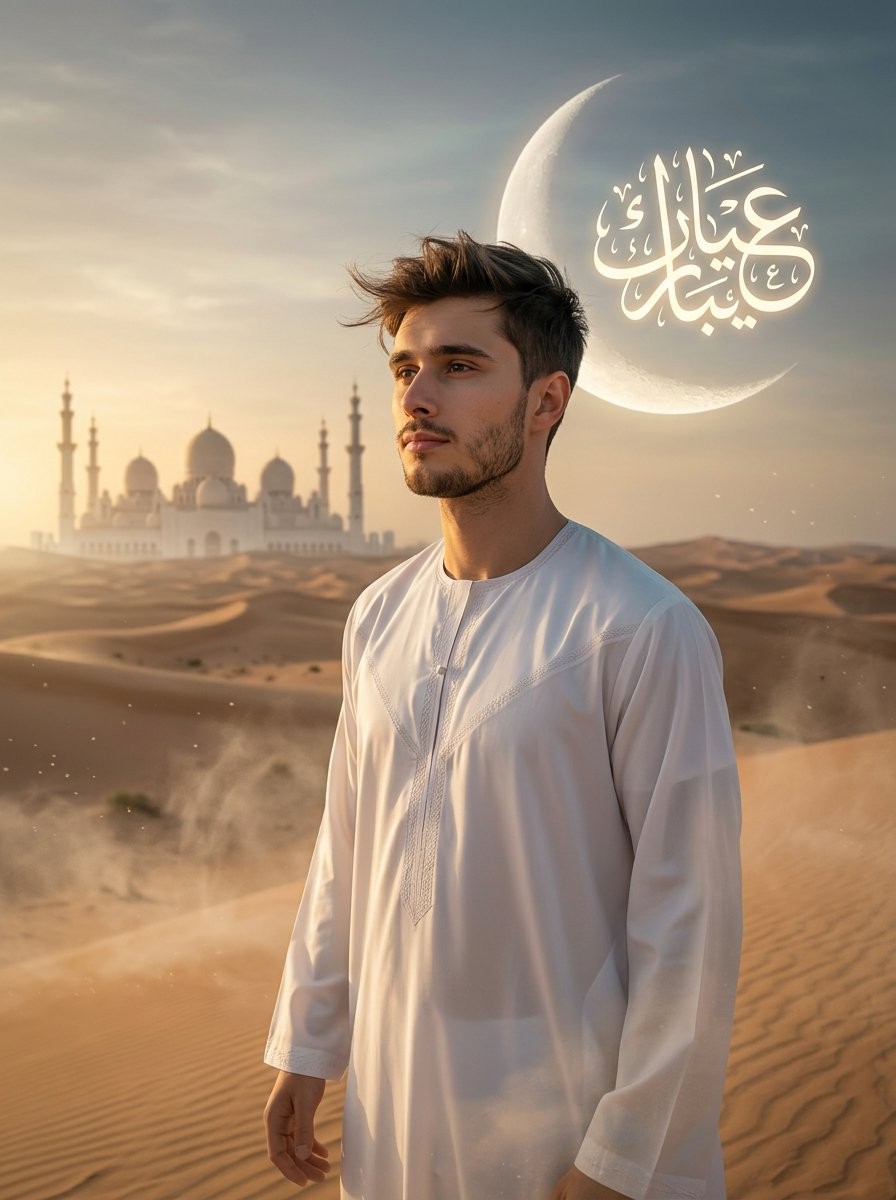CopySUBJECT: A young man (Same face as reference image)(mid-20s), strong features, short wind-swept hair, light beard. He stands calmly on top of a sand dune, facing slightly sideways toward the horizon. He wears a flowing traditional white thobe with subtle embroidery, gently moving in the wind. Expression is peaceful, reflective, and spiritual, symbolizing gratitude and celebration. ENVIRONMENT: Vast golden desert landscape with rolling sand dunes stretching into the distance. In the far background, a grand mosque silhouette with domes and minarets subtly emerges from the horizon. A large crescent moon is visible in the sky, slightly oversized for cinematic effect. Light desert mist and drifting sand particles add atmosphere. LIGHTING: Golden hour sunset transitioning into twilight. Warm golden sunlight hitting the dunes from a low angle, creating long shadows and texture. Soft cool tones beginning to appear in the sky. A gentle rim light outlines the subject, enhancing depth and separation. CAMERA & LENS: Shot on ARRI Alexa Mini LF, 35mm anamorphic lens. Cinematic depth of field with wide environmental capture. Slight lens flare from the sun. Film grain subtly present. COMPOSITION: Wide cinematic frame (16:9). Subject positioned on the top third of the frame (rule of thirds), standing on a dune ridge. Leading lines formed by sand dunes guiding toward the subject. Balanced negative space with sky and moon. STYLE & MOOD: Epic cinematic, spiritual, serene, and powerful. Inspired by high-end film stills. A blend of realism and poetic storytelling. Calm yet grand Eid atmosphere. DETAILS: Ultra-detailed sand textures, wind patterns on dunes, fabric flowing naturally, soft particles in air, realistic shadows, atmospheric depth, HDR, 8K resolution, cinematic color grading (warm gold + cool blue contrast). TEXT ELEMENT: "Eid Mubarak" written in elegant glowing Arabic calligraphy in the sky near the crescent moon, softly integrated into the scene.