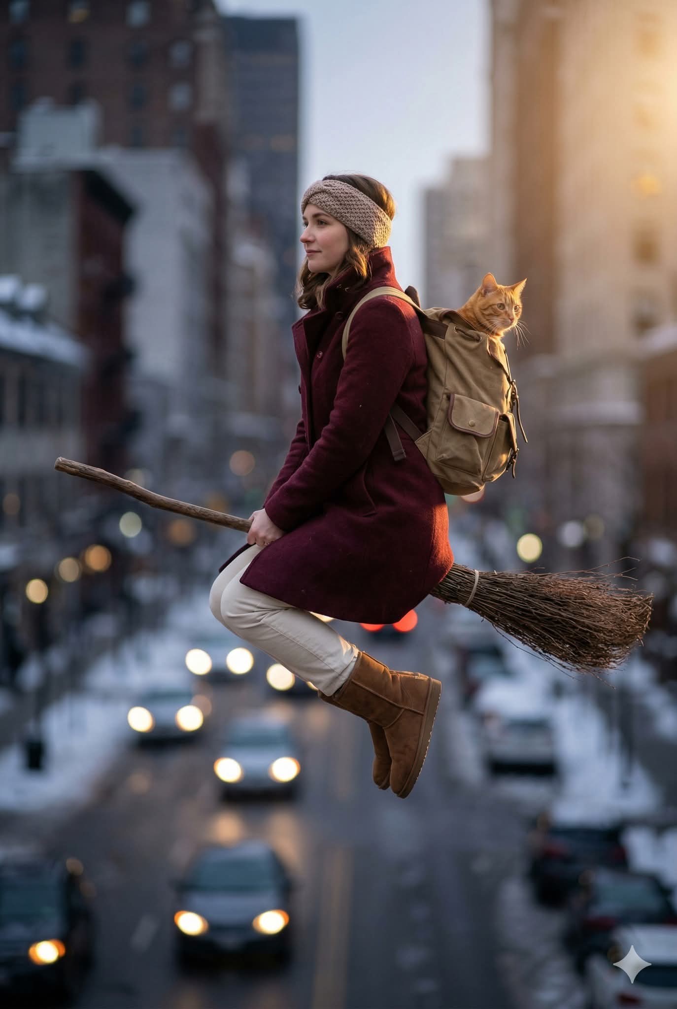 CopyA hyper-realistic cinematic photograph of a woman, featuring the uploaded face as reference, flying side-saddle on a rustic broomstick mid-air above a blurred city street. She wears a burgundy wool coat, cream trousers, brown suede boots, a knit headband, and a canvas backpack carrying an orange tabby cat looking backward. Shot with an 85mm lens, a shallow depth of field creates heavy bokeh of cars, headlights, and snowy urban buildings below. Golden hour lighting from the right casts warm rim light on the subject, contrasting her warm burgundy and brown textures against the cool, muted grays of the background, capturing a modern urban fantasy atmosphere in 8k resolution. 2:3 ratio.
