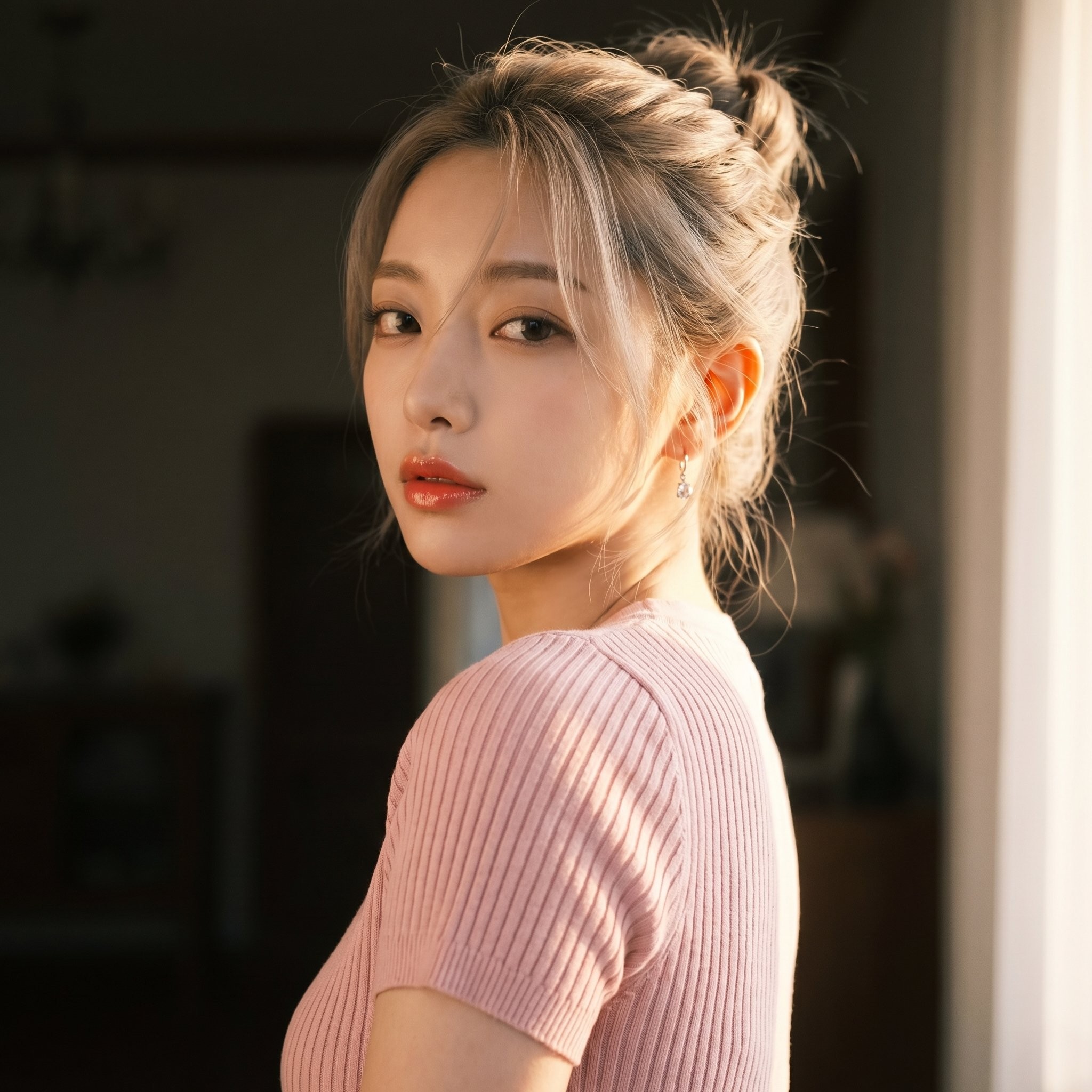 Copy{ "portrait_prompt": { "subject": { "description": "Based on <User Portrait>, a polished Korean beauty-style close-up portrait of a young woman turning back over her shoulder, with soft almond eyes, delicate eyeliner, long lashes, glossy coral-pink lips, luminous smooth skin, and light ash-blonde hair styled in a loose messy bun with wispy face-framing strands", "features": { "hair": "light ash-blonde hair in a loose messy bun with soft wispy strands around the face and neck", "eyes": "soft almond-shaped eyes with subtle eyeliner and clear catchlights", "expression": "calm, intimate, slightly dreamy expression" }, "pose": "over-the-shoulder close-up portrait, body turned away from the camera, head turned back toward the camera, shoulder pushed into the foreground" }, "attire": { "type": "Based on user-uploaded clothing reference", "details": [ "styled close to a fitted pastel pink ribbed short-sleeve knit top", "small silver dangling earrings", "minimal feminine beauty styling" ], "color": "As per clothing reference" }, "composition": { "shot_type": "Close-up", "focal_length": "85mm portrait lens", "aperture": "f/2-f/2.8", "camera_angle": "eye-level", "camera_height": "eye-level", "framing": "square 1:1 framing, face slightly left of center, shoulder filling the foreground, tight intimate crop, dark softly blurred background", "aspect_ratio": "1:1" }, "lighting": { "type": "warm late-afternoon window sunlight", "direction": "main light from camera-right and slightly behind, creating golden highlights on the ear, hair bun, cheek edge, neck, and shoulder, with soft ambient fill across the face", "mood": "warm, intimate, polished, quiet indoor beauty portrait" }, "color_palette": { "film_simulation": "Fujifilm Nostalgic Negative inspired color grading", "style": "soft Korean beauty portrait, polished lifestyle portrait", "tones": [ "golden warm highlights", "soft peach-pink skin tones", "muted dark indoor background" ], "grade_notes": [ "highlight roll-off: soft golden highlights with gentle glow", "shadow tint: neutral-to-warm shadows without muddy blacks", "contrast curve: gentle portrait contrast with clean tonal separation", "grain: very subtle fine grain, clean beauty finish" ] }, "environment": { "setting": "an indoor room near a window", "background": "dark softly blurred interior with minimal detail", "atmosphere": "quiet late-afternoon intimacy with a clean beauty-photo focus" }, "mood": "soft, romantic, delicate, intimate, dreamy", "technical_tags": [ "photorealistic", "beauty portrait photography", "close-up portrait", "over-the-shoulder pose", "warm natural sunlight", "shallow depth of field", "clean skin texture", "high-detail eyes", "natural retouch look" ], "character_reference": "Based on user-uploaded character reference", "clothing_reference": "Based on user-uploaded clothing reference", "negative_prompt": "direct flash, studio strobe, flat front lighting, outdoor scene, wide-angle distortion, gritty disposable camera look, heavy grain, plastic skin, over-smoothed beauty skin, broken anatomy, malformed shoulders, warped facial proportions, inconsistent sunlight direction, generic composition, random bokeh, excessive saturation, muddy shadows, harsh HDR, watermark, text overlay, logo" } }