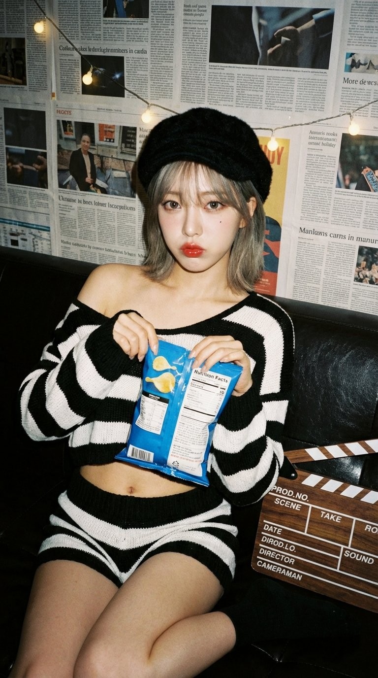 Copy{ "portrait_prompt": { "subject": { "description": "Based on <User Portrait>, a young woman with doll-like makeup — large round eyes with circle lenses, red glossy lips, rosy blush on porcelain-white skin, hair with wispy air bangs", "features": { "hair": "hair cascading over shoulders, wispy air bangs across forehead, soft messy texture", "eyes": "Large doll-like round eyes with circle contact lenses, subtle smoky eyeliner, long lashes", "expression": "Slightly pouty, languid, innocent yet rebellious — 'I don't care' cool girl energy", "makeup": "Y2K doll makeup: porcelain white base, rosy peach blush, red glossy lips, emphasized aegyo-sal under-eye" }, "pose": "Sitting casually, leaning slightly back, both hands holding a bag of chips at chest level — left hand gripping top edge, right hand cradling bottom, chin slightly tilted down looking into camera" }, "attire": { "type": "Based on user-uploaded clothing reference", "details": [ "Black and white wide horizontal striped off-shoulder crop top — chunky knit texture, oversized bell sleeves extending past wrists, cropped above navel exposing midriff", "Matching black and white wide striped drawstring shorts — same knit fabric, elastic waistband with black drawstring tie", "Black fuzzy/faux-fur newsboy cap with white leather buckle strap detail across front, slightly oversized with rounded animal-ear-like silhouette", "Overall Y2K matching set aesthetic — rebellious, playful, bold graphic stripes" ], "color": "Monochrome — black and white wide stripes, consistent across top and bottom as matching set" }, "props": { "primary": "Bag of chips (bright blue packaging) held at chest level — casual snacking prop adding 'cool girl doesn't care' narrative", "secondary": "Film clapperboard (wooden, UNIVERSAL STUDIOS style) leaning against couch on left side — establishes 'backstage/behind-the-scenes' story" }, "composition": { "shot_type": "Medium close-up (chest up, tighter framing per user request)", "focal_length": "35mm f/2.8", "camera_angle": "Straight-on, very slightly above eye level", "camera_height": "Seated eye-level (subject is sitting, camera at her seated eye height)", "framing": "Subject centered, fills 80% of frame, chips bag as foreground element at lower frame edge, cap and hair create top-frame interest, minimal headroom", "aspect_ratio": "4:5 (portrait, ideal for social media)" }, "lighting": { "type": "Direct on-camera flash — hard, unforgiving, snapshot aesthetic", "direction": "Frontal, slightly above lens axis", "mood": "Raw Y2K flash photography — skin appears porcelain-white with specular highlights, hard shadows cast behind subject onto dark couch and wall, no fill light, deep contrast between flash-lit subject and dim ambient background", "shadow_evidence": "Clear hard-edged shadow of subject visible on leather couch and wall behind" }, "color_palette": { "film_simulation": "Kodak Gold 200", "style": "Kodak Gold 200 film simulation, warm golden undertones in midtones, cool white direct flash on skin creating porcelain effect, deep rich blacks in shadows and leather, visible film grain, lo-fi indie snapshot vibe, slight color shift in highlights toward warm yellow", "tones": [ "Cool porcelain white (flash-lit skin)", "Deep rich black (leather, cap, hair, shadow areas)", "Warm golden-yellow midtones (Kodak Gold signature)", "Cyan-blue accent (chips packaging as color pop)" ], "grade_notes": [ "highlight roll-off: hard, flash-driven, slightly blown on skin", "shadow tint: warm golden leaning (Kodak Gold characteristic)", "contrast curve: high contrast — deep blacks vs flash-white skin", "grain: visible, medium grain — authentic film texture, NOT clean digital" ] }, "environment": { "setting": "Film studio lounge / creative backstage space", "background": "Dark leather couch/sofa, wooden film clapperboard propped on left, wall covered with newspaper clippings and vintage posters, decorative string lights/bulbs on upper left, wooden shelf with small objects", "atmosphere": "Backstage cool-girl energy, messy creative space, film industry props mixed with casual snacking — intentionally imperfect and lived-in" }, "mood": "Languid Y2K rebelliousness, doll-faced cool girl in a film studio eating chips — effortless, unbothered, playfully defiant", "technical_tags": [ "photorealistic", "Kodak Gold 200 film grain", "direct flash photography", "90s point-and-shoot aesthetic", "lo-fi indie vibe", "visible grain texture", "hard flash shadows" ], "character_reference": "Based on user-uploaded character reference", "clothing_reference": "Based on user-uploaded clothing reference", "negative_prompt": "soft lighting, studio softbox, natural window light, bokeh, airbrushed skin, over-processed, too clean, professional retouching, smooth gradients, HDR, diffused light, gentle shadows" } }