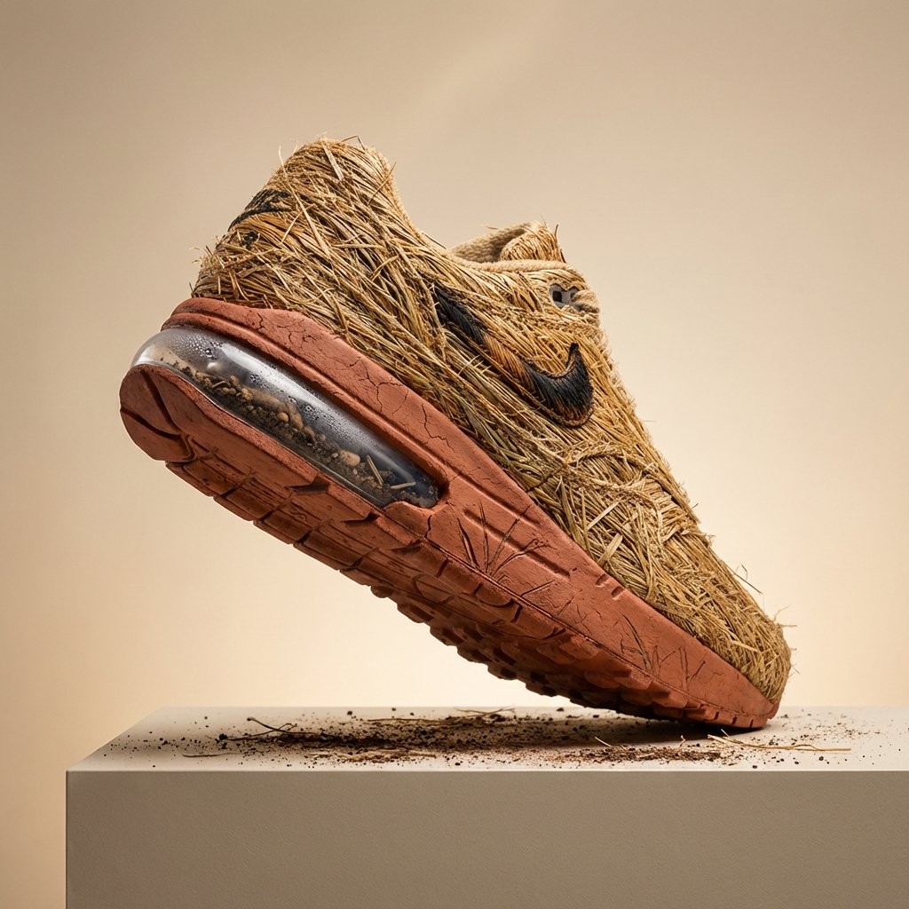 Copy{ "Objective": "Create a premium hero product shot of a Nike Air Max sneaker reimagined with organic earth materials, blending raw nature with high-end commercial presentation.", "Composition": { "layout": "hero product centered", "aspect_ratio": "1:1", "framing": "single sneaker prominently displayed, slightly angled (3/4 view), elevated on minimal pedestal" }, "Product": { "type": "Nike Air Max (organic concept)", "structure": { "sole": { "material": "hardened red clay", "details": ["visible grass imprints pressed into clay", "cracked dry texture", "earthy matte finish"] }, "upper": { "material": "tightly woven dry straw/grass", "details": ["intricate woven pattern", "natural fiber texture", "slight fraying at edges for realism"] }, "air_unit": { "design": "transparent air bubble", "details": ["filled with dirt particles and tiny pebbles", "imperfect clarity with natural debris", "subtle condensation or dust"] } }, "branding": { "logo": "Nike swoosh subtly integrated using darker woven fibers or burnt grass texture" } }, "Lighting": { "type": "premium product lighting", "setup": ["soft overhead key light", "side rim light to highlight textures", "subtle shadow grounding the shoe"], "effect": "enhanced texture visibility (grass, clay cracks, dirt inside air bubble)" }, "Style": { "aesthetic": "Nike commercial meets raw nature", "mood": "earthy, grounded, innovative, tactile", "color_palette": ["clay red", "dry grass beige", "earth brown", "soft neutral background"] }, "Rendering": { "realism": "ultra photorealistic", "detail_level": "extreme (micro textures, fibers, dirt, cracks)", "aspect_ratio": "--ar 1:1" } }
