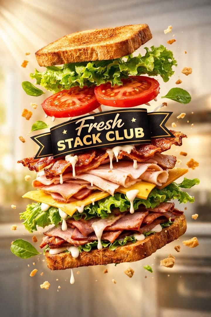 CopyHigh-end commercial product photography of a sandwich labeled "Fresh Stack Club", floating mid-air in a layered exploded tilt view, vibrant multi-layer textures with sauce dripping realistically. Surrounded by flying lettuce, tomato, bread crumbs. Background features a cinematic bright kitchen gradient with soft sunlight rays and depth blur for a fresh, healthy ad look.