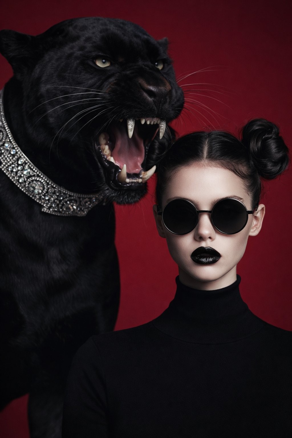 CopyHigh-fashion editorial portrait of a pale woman with symmetrical double space buns, round black sunglasses, glossy black lipstick, wearing a black turtleneck, calm expression. A roaring black panther stands behind her wearing a diamond jeweled collar. Bold red studio background, dramatic lighting, luxury fashion magazine aesthetic, ultra-detailed, cinematic contrast, sharp focus, Vogue style, photorealistic, dark elegant mood.