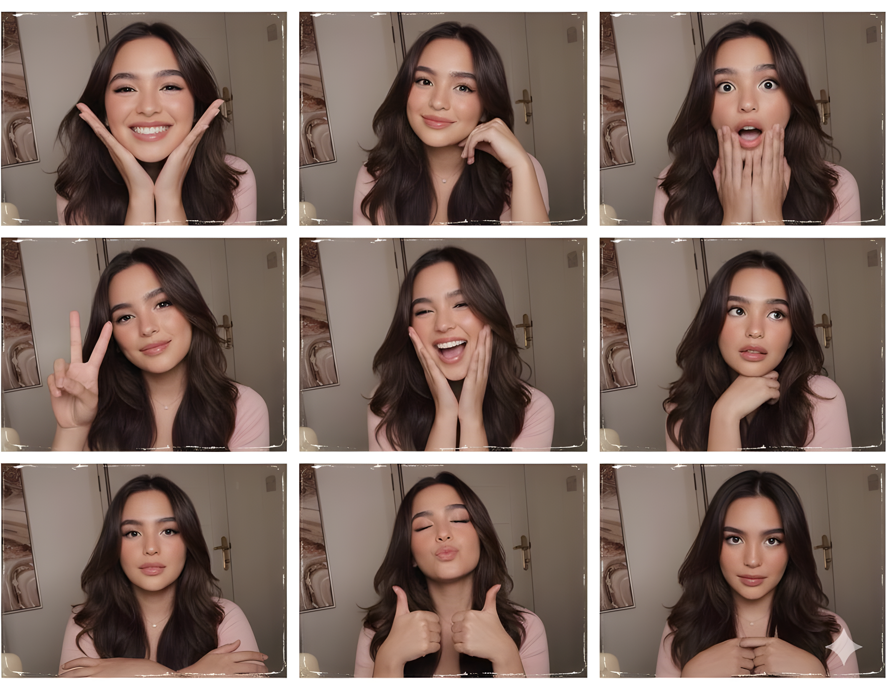 CopyUsing this photo, create a 3x3 photo booth grid with each image featuring different poses and expressions, no duplicates allowed.