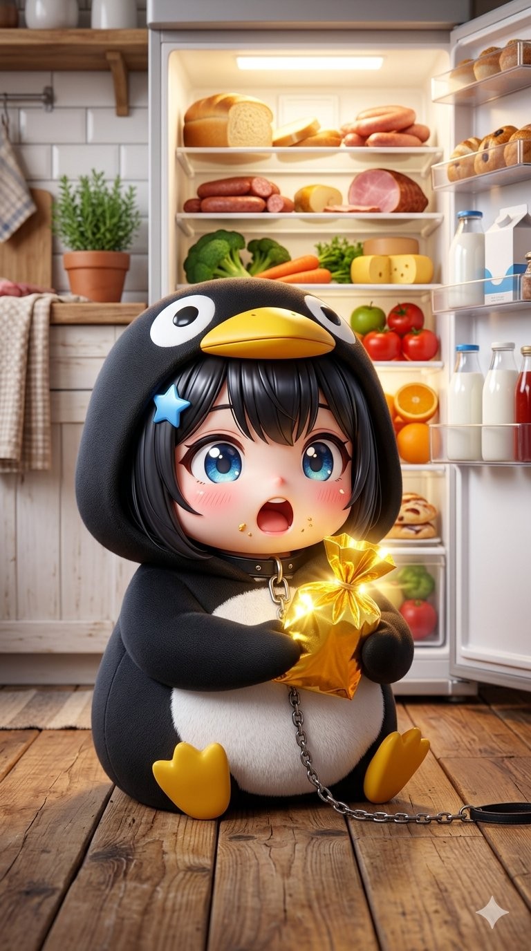 CopyA highly detailed chibi anime girl sitting on a wooden kitchen floor, wearing a cute black-and-white penguin onesie hoodie with a big yellow duck-like beak and large cartoon eyes on the hood, black bob haircut with bangs, huge sparkling blue eyes full of surprise, wide open mouth, rosy blush cheeks, tiny blue star hair clip, yellow crumbs on her face. She has a black collar with a metal chain attached, holding a shiny glowing golden gift bag wrapped in crinkled foil with a bright yellow bow, the chain trailing on the floor. In front of her is a brightly lit open refrigerator packed with realistic food: loaves of bread, sausages, ham, broccoli, carrots, tomatoes, oranges, apples, cheese, milk cartons, and eggs on every shelf. Cozy modern kitchen background with white brick tiles, wooden counter, potted green plant, hanging towel, soft warm lighting from the fridge, vibrant colors, ultra-detailed, cinematic, adorable 3D render style, masterpiece, best quality, sharp focus, 8k.