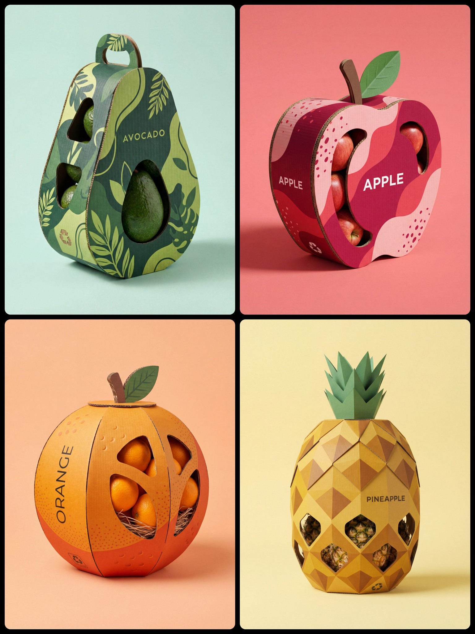 CopyA high-quality professional product photography of a creative structural packaging design for [Fruit Name]. The packaging is made of premium corrugated cardboard, intricately crafted into the literal shape of a giant stylized [Shape e.g. spherical, curved, elongated] [Fruit Name]. The exterior surface features a vibrant and sophisticated printed pattern of minimalist [Pattern Description e.g. geometric hexagons, organic wavy lines, dotted stippling, botanical line-art, or horizontal ridges], mimicking the Natural Skin of the Fruit in a duo-tone palette of [Color 1] and [Color 2]. Features clever die-cut windows that reveal the actual [Actual Product Inside] stored inside. Minimalist modern typography on the side saying "[NAME]". Includes eco-friendly details like a small recycling logo and a [3D Corrugated Cardboard Detail: Stem/green Leaf/Crown] on top. Soft studio lighting with gentle shadows, placed on a clean solid pastel [Background Color] background. 8k resolution, photorealistic, cinematic composition, industrial design aesthetic.