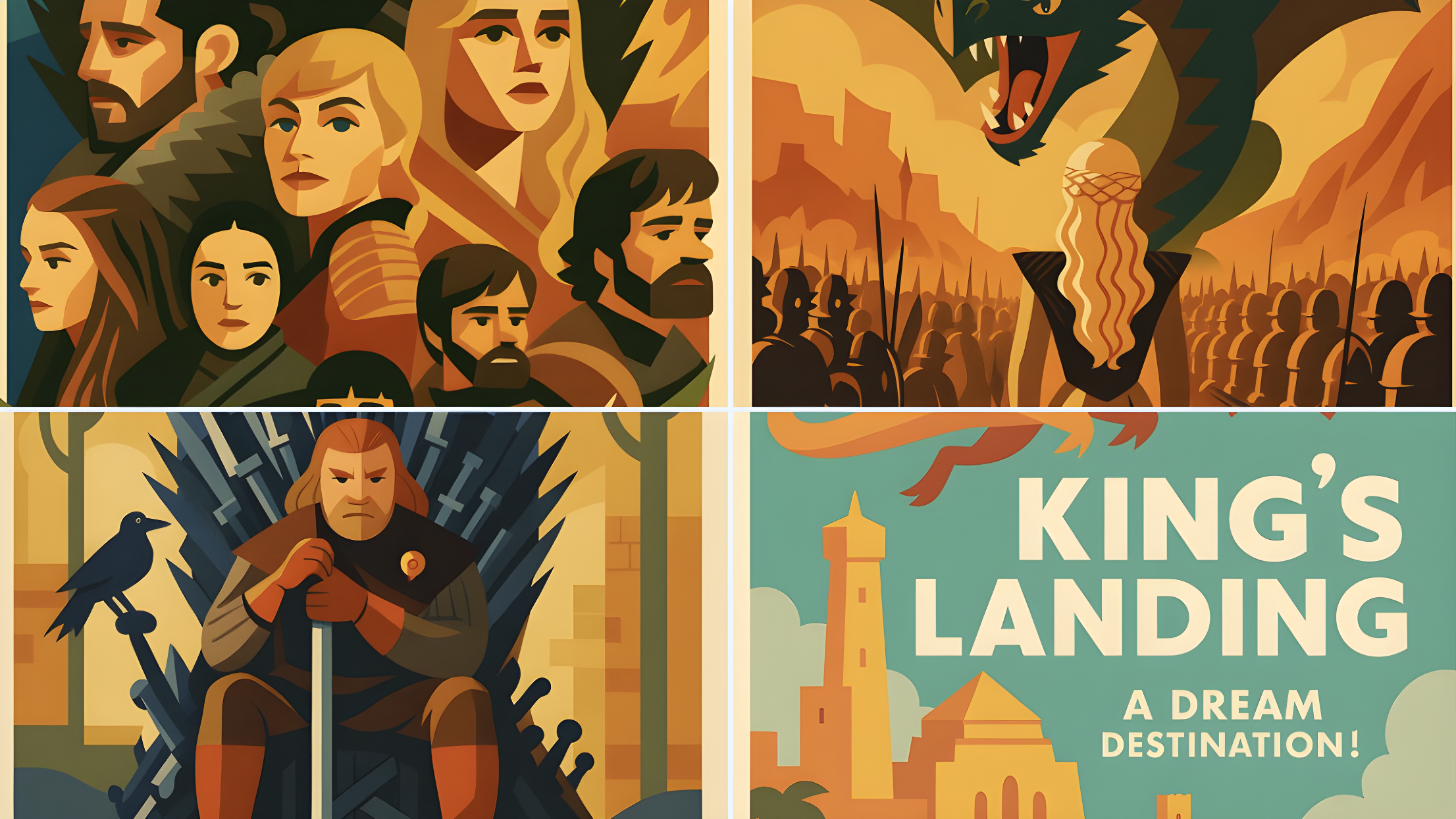 CopyTransform this image into a 1950s poster in the style of mid-century modern graphic designers. Use flat, geometric color blocks with strong typographic elements. The overall tone should be optimistic, nostalgic, and promotional. Add bold location labels and promotional slogans.