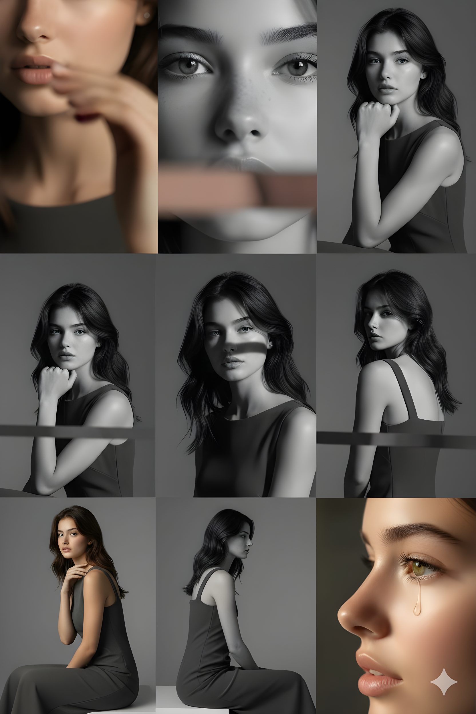CopyEditorial 3x3 grid in a cool-grey seamless backdrop. Character (face characteristics 100% same as uploaded image) wearing a charcoal sleeveless dress. Lighting: large overhead softbox, faint side bounce. Shots include: 1. tight cheek + neck close-up with blurred finger foreground (85mm, f/1.8); 2. eyes locked to lens, top-light reflection visible (85mm, f/2.0); 3. monochrome chin-on-hand portrait with strong frame fill (50mm, f/2.2); 4. half-obscured over-shoulder shot through blurred dress strap (85mm, f/2.0); 5. head-on close-up with intersecting shadows across face (50mm, f/2.5); 6. angled raw portrait with tousled hair (85mm, f/2.2); 7. tight detail of hands resting near collarbone (50mm, f/3.2); 8. seated half-body profile with blurred frame edges (35mm, f/4.5); 9. profile macro with single water droplet highlight (85mm, f/1.9). RAW, smooth contrast, editorial softness.