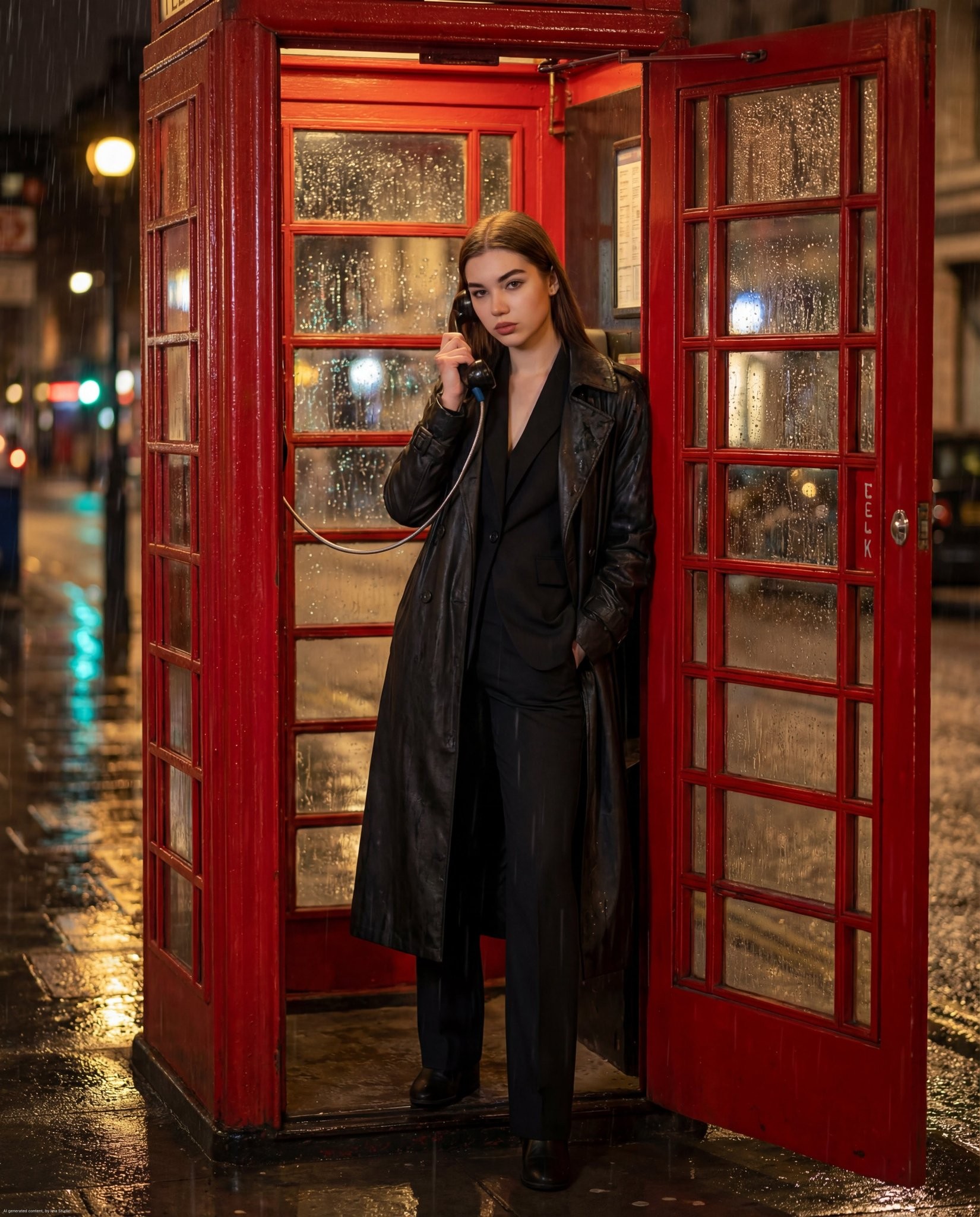 Copy{ "type": "image_generation_prompt", "style": "ultra-photorealistic, cinematic, high-end fashion editorial", "aspect_ratio": "1:1", "resolution": "high resolution, maximum realism", "scene": { "time": "night", "weather": "rainy", "location": "urban London street" }, "environment": { "primary_setting": "inside a classic red British telephone booth", "ground": "wet pavement reflecting city lights", "atmosphere": ["visible raindrops under soft street lighting", "subtle fog in the background", "blurred headlights", "cinematic bokeh lights"] }, "subject": { "gender": "female", "appearance": { "physique": "fit, elegant, confident presence", "expression": "serious, confident, charismatic", "pose": { "full_body_visible": true, "stance": "standing inside the telephone booth", "right_hand": "holding the old-fashioned phone receiver", "left_hand": "casually inside coat pocket" } }, "clothing": { "outfit": "tailored black suit", "outerwear": "long dark trench coat slightly wet from rain", "style": "elegant, cinematic, fashion editorial" } }, "lighting": { "type": "moody cinematic street lighting", "effects": ["dramatic contrast", "realistic rain reflections on glass panels", "soft highlights on wet surfaces", "natural reflections from city lights"] }, "camera": { "framing": "full-body shot from head to toe", "composition": "centered subject inside telephone booth", "focus": "sharp focus on subject, soft blur in background", "style": "cinematic photography" }, "mood": { "tone": "dark, elegant, cinematic", "aesthetic": "high-end fashion editorial with urban atmosphere" }, "output_goal": "Create an ultra-photorealistic cinematic night scene of a confident woman standing inside a classic red British telephone booth in rainy London, with dramatic lighting, realistic reflections, and a high-end fashion editorial aesthetic." }