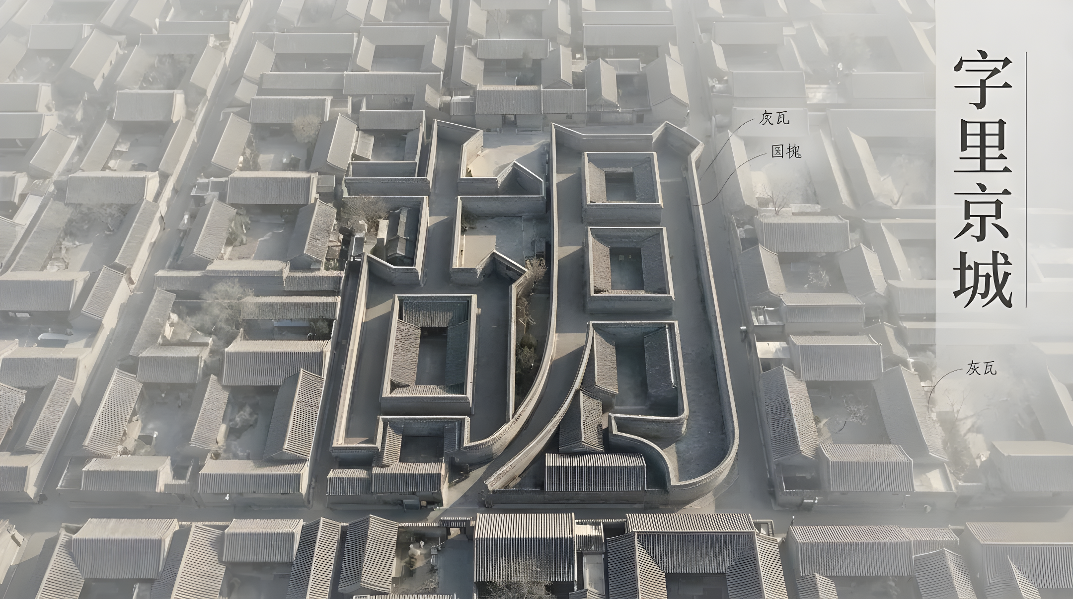 CopyAspect ratio 16:9, a masterpiece of subtlety and visual intelligence. A drone's-eye view of old Beijing's urban fabric. The core concept is the Chinese character "衚" **perfectly and seamlessly** integrated into the entire cityscape. **Integration of Typography and Architecture (The Ultimate Subtlety):** - **No Physical Elevation:** The character "衚" is not an independent, towering, or massive structure. The walls forming its strokes are **identical in height, material, and style** to all surrounding hutong and siheyuan walls. It exists within the fabric, not above it. - **"Sculpted by Light and Shadow":** The character's form is not emphasized by structure, but revealed by **masterful, atmospheric lighting**. A low-angle afternoon raking light sweeps across the scene. The light precisely catches the edges of the walls forming the "衚" character, making them subtly brighter, while casting deep, sharply defined shadows within its "strokes" (the hutongs). This character is revealed by light, not built by concrete. - **"Atmospheric Perspective":** A thin, ground-hugging morning mist or haze permeates the surrounding courtyards and alleys, slightly softening distant details. However, the paths and courtyards forming the "衚" character are **subtly clearer and have higher contrast**, creating a natural visual focus that allows the hidden shape to emerge in the viewer's gaze. **Elegant Typographic Layout:** Retaining refined and artistic font design. - **Main Title:** The title "字里京城" is set in a strong single vertical column on the right. The background area is subtly treated with a semi-transparent, faded effect to ensure text legibility without being obtrusive. The font is an elegant "New Song" style. An extremely thin vertical line runs parallel to the text. - **Information Labels:** Label text ("灰瓦", "国槐") uses small, delicate handwriting fonts. They connect to objects via hand-drawn, pencil-like, needle-thin curves. **No boxes, no glow effects.** **Aesthetics:** The overall tone is serene, contemplative, and profound. The color palette is sophisticated "advanced gray," dominated by desaturated colors, with the only color accent coming from the sun's warm touch. The image possesses an aura of "a secret in plain sight," rewarding the viewer's patience and insight. It is a hyper-realistic render with deep painterly quality and philosophical atmosphere. **Negative Prompts:** Towering walls, sculptural Chinese characters, massive structures, overly obvious character shapes, even lighting, flat light, glowing boxes, futuristic UI, sans-serif fonts, abstract, 2D, vibrant colors, cartoonish, poor calligraphy, watermarks.
