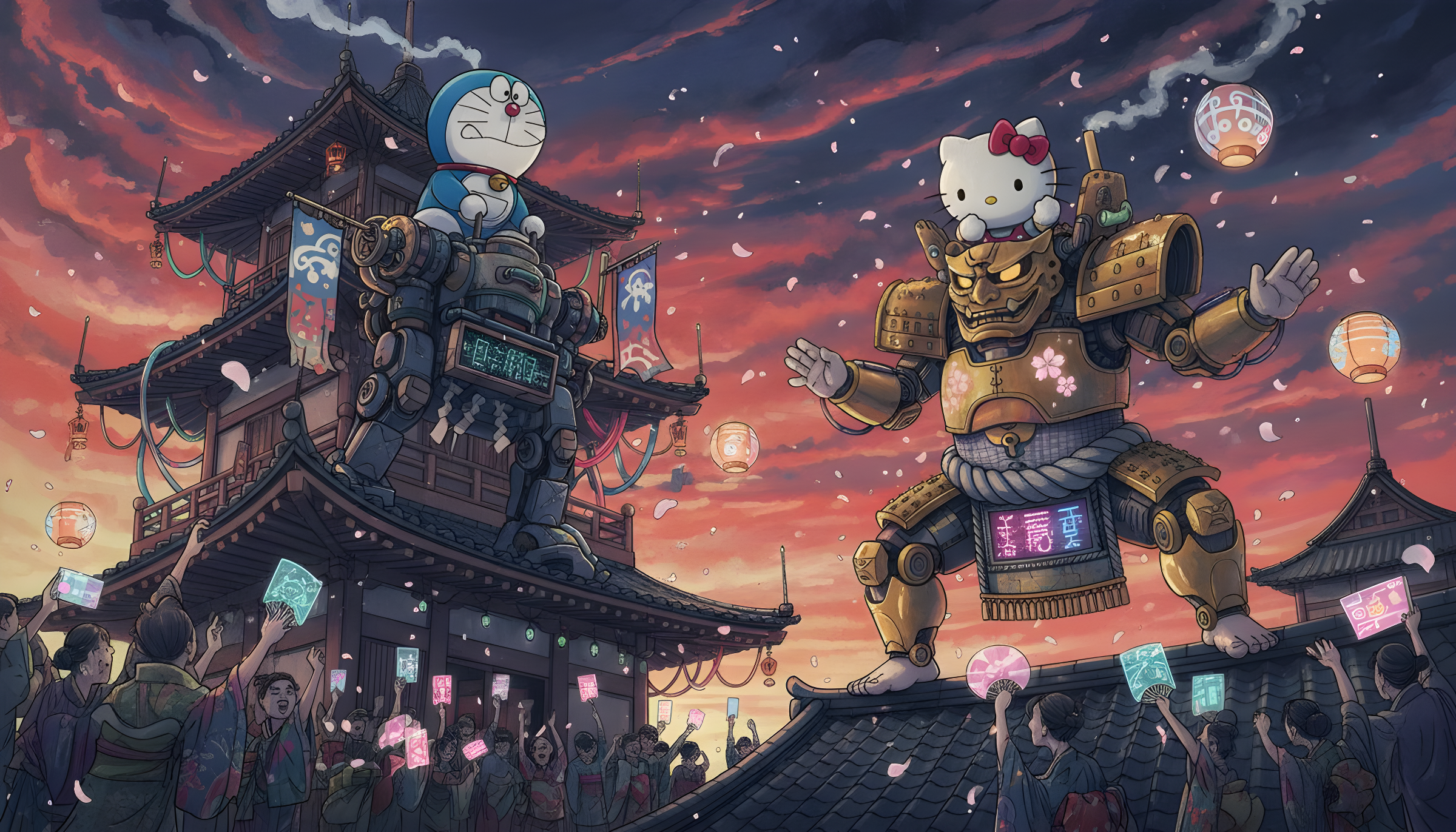 CopyCreate a highly detailed surreal Japanese sumi-e illustration blending ancient Edo-period aesthetics with futuristic absurdity. At twilight, under a vast sky streaked with vermilion and indigo brushstrokes, Doraemon stands atop a traditional pagoda roof reinforced with glowing fiber cables and neon scaffolding. He pilots a weathered, patchwork mecha painted in faded indigo lacquer, shaped like a vintage wind-up toy with exposed gears, silk-banner decals, and steam exhausts puffing from shoulder vents. The mecha wears a digital mawashi displaying shifting kanji runes. Doraemon’s expression is intense but comically determined, his paw gripping a lever made from polished bamboo and chrome. Across the composition, Hello Kitty appears inside a towering golden-armored mecha resembling an ornate Hannya mask, with sakura-shaped LEDs pulsing across its chestplate. Her stance mirrors that of a sumo rikishi mid-tachiai, legs wide, palms extended, toes digging into the glowing tatami rooftop below. Tiny holographic cherry blossoms swirl in the air, catching the last ambient light from futuristic Edo lanterns floating in midair via anti-gravity rings. Below, dozens of onlookers in layered kimono-hologram hybrids cheer with glowing fans shaped like old kabuki masks. Some wear AR visors shaped like fox spirits, their faces half-lit by the flickering light of vending machines embedded in shrine walls. In one corner, an elderly monk with cybernetic arms calmly sketches the scene on a floating washi-scroll, eyes glowing faintly behind antique round glasses. The entire piece is rendered in expressive sumi-e ink washes with chaotic splashes for motion trails, delicate dry-brush hatching for armor texture, and faint pastel watercolors to accent light sources. Negative space is used deliberately around the combatants to amplify their presence. A red artist seal (宝雷印) is stamped boldly in the lower corner, harmonizing the traditional technique with the scene’s absurd modernity.