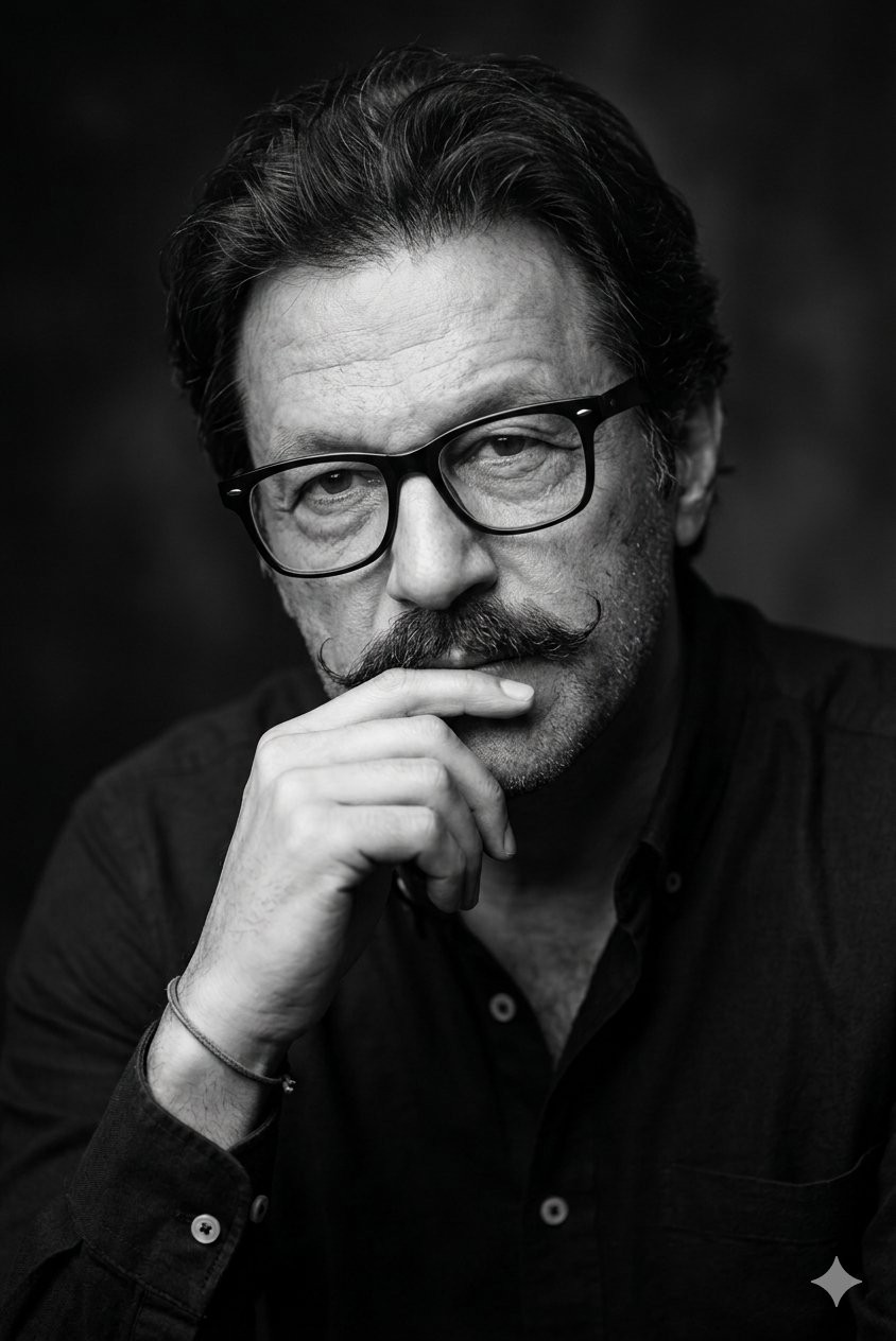 CopyBlack and white close-up portrait of a thoughtful middle-aged man with curly dark hair, wearing thick black-rimmed rectangular glasses, and a distinctive curled handlebar mustache. He is resting his chin on his right hand in a pensive pose, index finger touching his mustache, looking slightly to the side with an intelligent and contemplative expression. Dramatic studio lighting with strong contrast, soft shadows, and a dark textured background. He is wearing a dark button-up shirt. Cinematic, moody, high-detail photography in the style of classic black and white portraiture, sharp focus on face and eyes, shallow depth of field, 8k resolution, photorealistic.