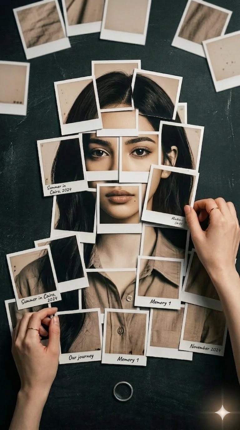 CopyA top-down flat lay view of a creative composition. Multiple Polaroid-style photographs are arranged and overlapped on a dark, textured surface to form a cohesive, life-sized portrait of a young, beautiful, fair-skinned Middle Eastern woman with dark hair, wearing a light brown button-down shirt. Two hands are visible in the frame, gently holding and adjusting the Polaroid pieces as if putting together a puzzle. Several of the Polaroid borders feature small, handwritten notes like 'Summer in Cairo, 2024' and 'Memory 1'. The lighting is moody, artistic, and nostalgic, with a slightly desaturated color palette.