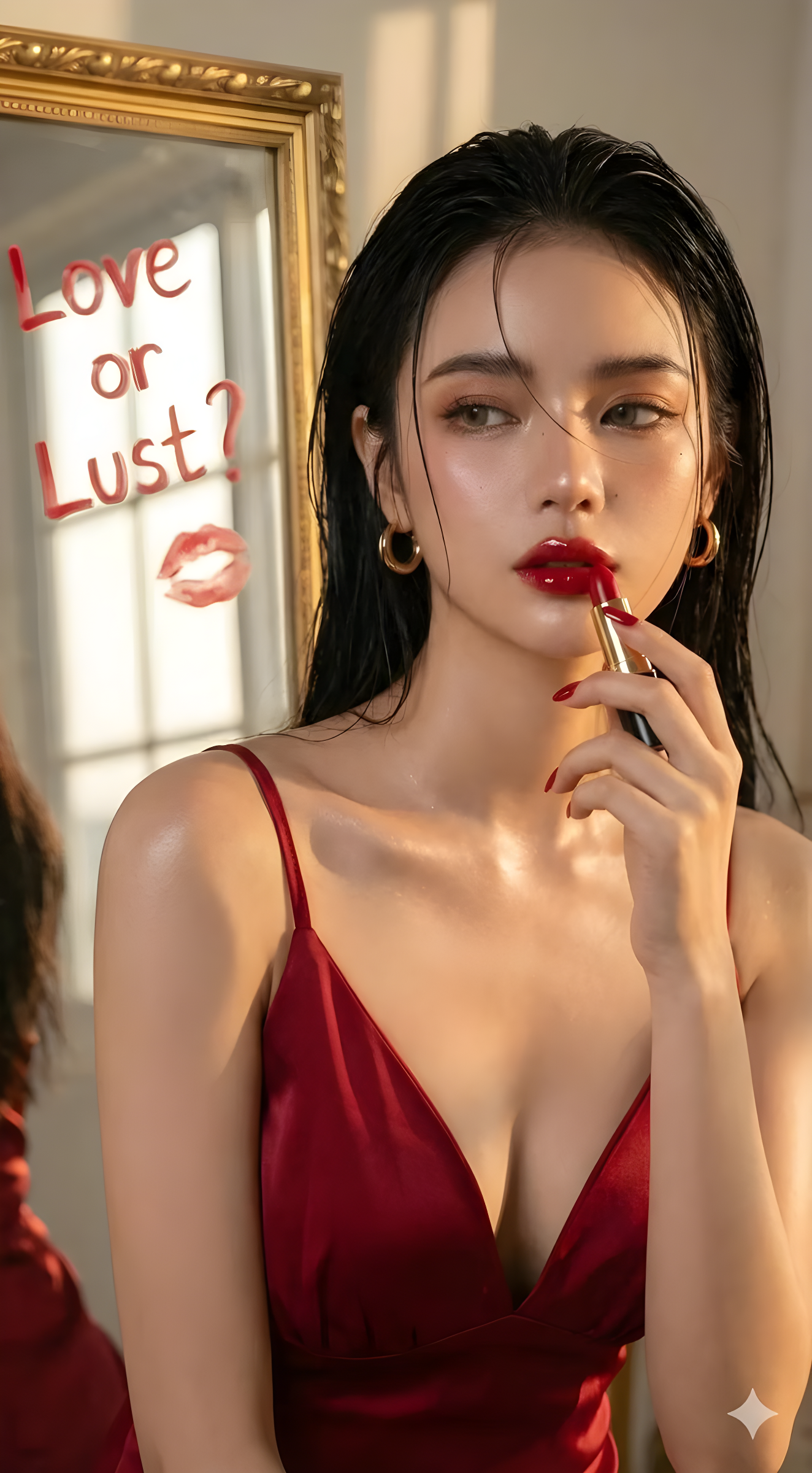 Copy{ "prompt_description": { "subject": { "type": "young woman", "hair": "wet slicked-back dark hair with loose strands framing the face", "skin": "glowing dewy skin with visible highlights on cheekbones collarbones and shoulders", "expression": "confident sultry gaze looking off-camera" }, "outfit": { "dress": "deep red satin spaghetti-strap dress with plunging neckline", "accessories": ["gold hoop earrings", "classic red lipstick bullet held near lips"] }, "makeup": { "lips": "glossy cherry-red", "cheeks": "softly contoured", "eyes": "warm bronze eyeshadow subtle eyeliner long lashes", "brows": "naturally defined" }, "pose": { "body": "shoulders angled slightly toward the mirror", "head": "gently tilted", "hands": "delicate fingers holding lipstick near lips" }, "environment": { "setting": "standing in front of a vintage gold-framed mirror", "mirror_text": { "text": "Love or Lust?", "style": "written in red lipstick with a kiss mark imperfect handwritten look" }, "lighting": "warm golden-hour sunlight through a window", "background": "softly blurred intimate editorial atmosphere" }, "composition": { "framing": "tight-medium portrait", "focus": "emphasis on facial features makeup texture and glossy skin" }, "camera_details": { "camera": "Canon EOS R5 or Sony A7R IV full-frame", "lens": "85mm f/1.8 prime", "aperture": "f/1.8 to f/2.2", "iso": "100-200", "shutter_speed": "1/200s", "focus": "sharp on eyes and lips" }, "style": { "lighting_type": "natural window light no harsh flash", "color_grading": "warm tones soft contrast cinematic skin rich reds subtle film look", "aesthetic": "high-end beauty editorial Vogue-inspired cinematic realism" }, "quality": { "resolution": "ultra-realistic 8K", "photography": "professional fashion photography" } } }