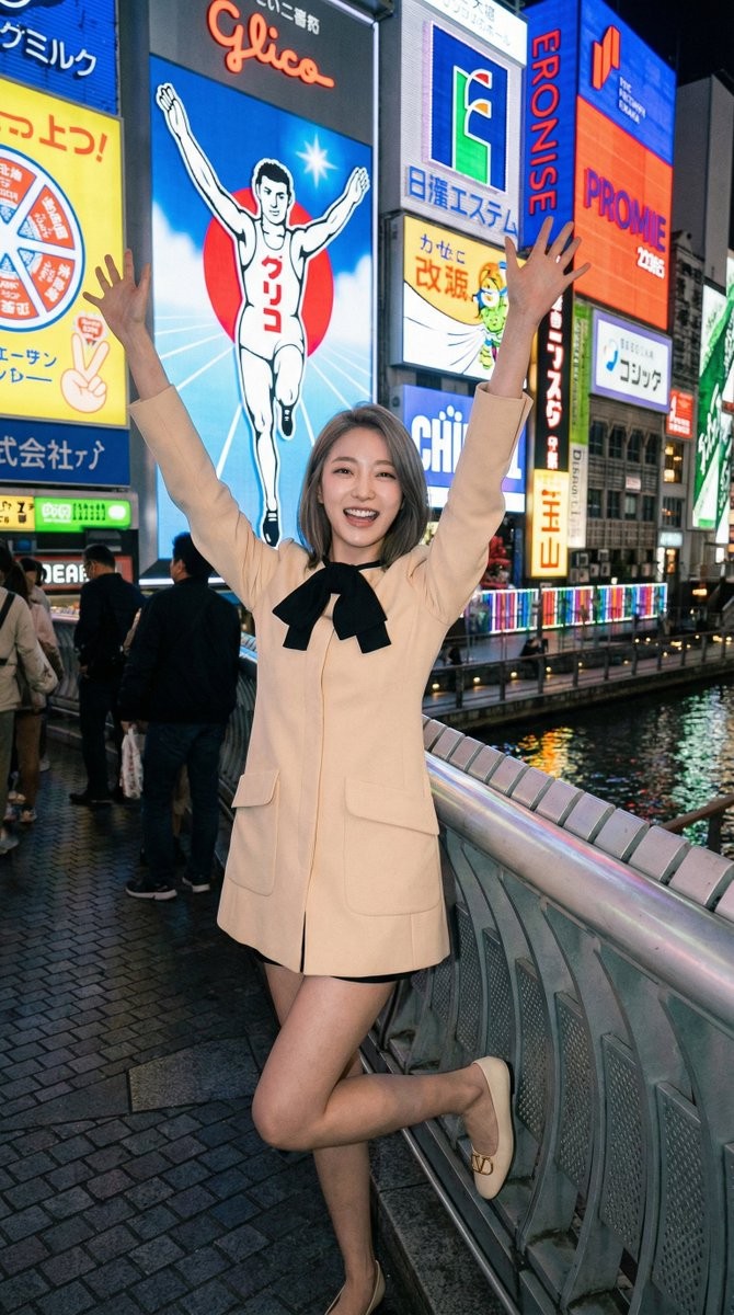 Copy{ "portrait_prompt": { "subject": { "description": "Based on <User Portrait>, a young woman standing on Ebisubashi Bridge in Dotonbori Osaka at night, BOTH ARMS RAISED HIGH above her head — mimicking the iconic Glico Running Man pose on the billboard directly behind her.bright smile full of excitement and joy.", "features": { "eyes": "Bright, sparkling with genuine excitement, looking directly at camera", "expression": "Ecstatic wide smile, mouth slightly open, the pure joy of a tourist at an iconic landmark — radiating 'I made it here!' energy" }, "pose": "Standing with BOTH arms fully stretched straight up above head, elbows locked, directly mirroring the Glico Running Man billboard pose behind her. Body weight centered, slight hip tilt for dynamism, legs together in a confident stance. The pose creates a visual echo: human below = billboard figure above." }, "attire": { "type": "Based on user-uploaded clothing reference", "details": ["Maintain style from reference", "Outfit should be winter-appropriate for Osaka night temperature"], "color": "As per clothing reference" }, "composition": { "shot_type": "Full body (cut at mid-calf level)", "focal_length": "28mm f/2.8", "aperture": "f/2.8", "camera_angle": "Slightly low angle — camera at subject's waist height, tilted up 10-15 degrees to capture both subject AND the large Glico billboard above/behind in one frame", "camera_height": "Waist-level, shooting upward", "framing": "Centered symmetry — subject dead center of frame, arms raised creating a V-shape that echoes the Glico man's pose directly above/behind. Bridge metal railings on both sides create converging leading lines. FG: bridge railing metal bars on left and right edges. MG: subject in sharp focus, full body. BG: the iconic Glico Running Man neon billboard (red circle with running figure), surrounding Japanese neon signs, and the Dotonbori canal with colorful neon reflections on water surface on the right side.", "aspect_ratio": "4:5" }, "lighting": { "type": "Multi-source urban neon night lighting — NO flash. The neon billboards behind and around the subject serve as practical light sources creating rich colorful ambient fill", "direction": "Primary backlight from the large Glico billboard (red/white/blue glow from above-behind). Secondary fill from surrounding neon signs on both sides (warm yellows, cool whites, greens). Combined ambient scatter creates even illumination on face", "mood": "Electric urban night glow — neon light wraps around subject from all directions, creating a colorful halo effect. Skin warmly lit by scattered neon. No harsh shadows on face." }, "color_palette": { "film_simulation": "Classic Negative (CN)", "style": "Fujifilm Classic Negative inspired color grading — warm amber highlights from neon signs, cooler teal-blue shadows in the night sky and canal water, punchy but not over-saturated neon colors, natural warm skin tones, slight nostalgic travel-snapshot quality", "tones": [ "Rich neon reds and blues from the Glico sign", "Warm amber/yellow from Japanese shop signs", "Deep navy night sky with neon glow", "Canal water reflecting multi-colored neon as abstract color streaks", "Warm natural skin tones — peachy, healthy" ], "grade_notes": [ "highlight roll-off: medium — neon signs can clip slightly for glow effect, skin highlights stay soft", "shadow tint: cool teal-blue in night sky and dark areas, CN's signature warm-cool split", "contrast curve: medium-high — punchy enough for neon to pop, shadows retain clothing detail", "grain: subtle — just enough for travel film authenticity" ] }, "environment": { "setting": "Ebisubashi Bridge, Dotonbori, Osaka, Japan — the most iconic tourist photo spot in Osaka, nighttime", "background": "The legendary Glico Running Man neon billboard — a large illuminated sign featuring a male runner in athletic pose against a red circle, surrounded by blue/white graphics. Flanked by other iconic Japanese neon signs. The Dotonbori canal visible on the right with multi-colored neon reflections dancing on dark water surface.", "atmosphere": "Peak Osaka nightlife energy — electric neon air, canal reflecting kaleidoscope colors, dense glowing signage creating the unmistakable Dotonbori atmosphere" }, "mood": "Pure tourist euphoria — infectious joy of standing at an iconic landmark and fully committing to the pose. Youthful, energetic, playful, unapologetically excited.", "technical_tags": ["photorealistic", "night photography", "neon lighting", "urban nightscape", "subtle film grain", "travel photography", "shallow depth of field"], "character_reference": "Based on user-uploaded character reference", "clothing_reference": "Based on user-uploaded clothing reference", "negative_prompt": "direct on-camera flash, harsh white flash on face, flat lighting, daytime, empty background, no neon signs, blurry subject, over-processed HDR, unnatural neon colors, too dark face, underexposed subject, studio lighting, stiff pose, arms down" } }