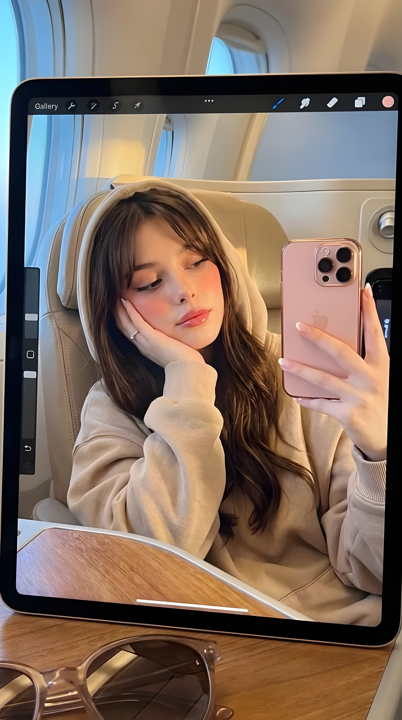 CopyA highly realistic, tightly framed scene showing the reflection of a fair-skinned woman with flawless skin on an iPad placed on the airplane’s foldable tray table in front of the subject, with a pair of sunglasses positioned in the foreground as an aesthetic element. Beige/grey cabin seats fill the area surrounding the iPad. On the iPad screen, the subject appears half-reclining on the airplane seat. Her left hand supports her head, fingers gently touching her temple in a relaxed gesture. Her right hand holds an iPhone 16 Pro Max to take the picture, with part of her face visible on the tablet screen. Her expression is soft, eyes slightly looking downward, giving a dreamy and calm feeling. She is wearing an oversized beige hoodie made of thick, soft fabric, with the hoodie pulled over her head. Minimalist silver rings. French nail art. Her hair is long, straight with layered cuts and beautiful volume, parted in the middle with soft front bangs covering her forehead and framing her face, in dark brown with subtle highlights. Her skin is bright, fair, and flawless with soft Korean glam makeup. Pink blush on her cheeks. Glossy rosy pink lips. Thin eyeliner and curled lashes. The environment visible behind the reflection is minimalistic yet lively: a premium/business class airplane cabin interior. A large airplane window shows soft blue light from the sky outside. The iPad camera UI—shutter button, small icons, and dock—are clearly visible on the screen. Soft-warm × pastel aesthetic tone. Edited in a “K-aesthetic soft glow” style. 9:16 portrait aspect ratio, HD, high quality. **Do NOT change the face.