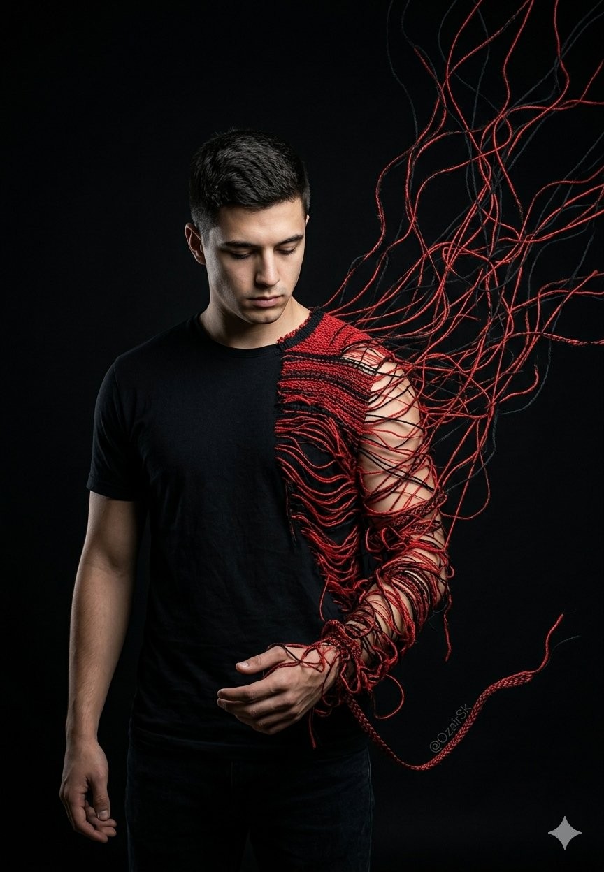 CopyA standing male figure, photographed from the waist up, whose entire right arm and shoulder is slowly unraveling into thousands of red and black threads like a sweater being pulled apart — the threads float and drift upward into darkness above. His face is stoic, looking down at his dissolving hand with quiet acceptance. Background is a deep matte black. Left side of body is perfectly normal, photorealistic skin. The contrast between the real and the unraveling is the entire story. Studio lighting, single soft key light from the left. Thread textures ultra-detailed, each strand individually visible. On one of the longer drifting threads near the bottom, visible only on close inspection. Vertical 9:13 format.