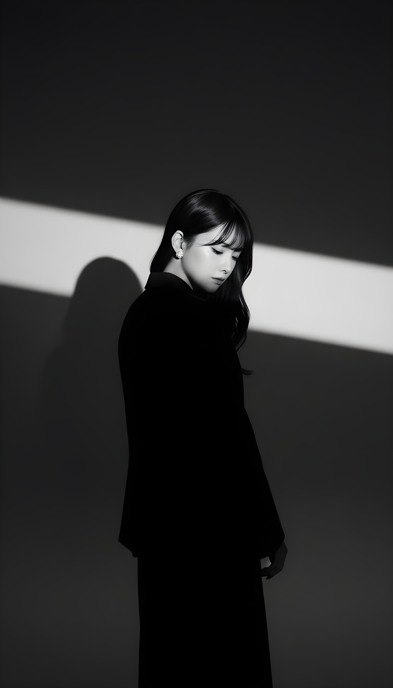 CopyA dramatic black and white studio portrait. The subject stands with their back to the camera, upper body slightly turned to the side, head tilted downward, with a partially visible profile. The expression is calm and introspective, creating a quiet, mysterious atmosphere. Lighting: A strong side light casting sharp contrasts. A clean horizontal beam cuts across the background wall. Most of the scene is in shadow, emphasizing silhouettes and outlines. Mood: Minimalist, emotional, cinematic, evoking elegance and solitude. The subject wears a dark jacket that blends into the shadows, presenting a sleek, polished fashion magazine style. Composition: Shot with a full-frame camera, 85mm lens, f/1.8 aperture for shallow depth of field, ISO 200, shutter speed 1/125s. Medium shot (from waist to head), highlighting the silhouette, profile, and posture. Post-processing: High-contrast black and white effect, soft tonal gradients, deep shadows, with subtle film grain added for texture, resulting in a refined artistic magazine style.