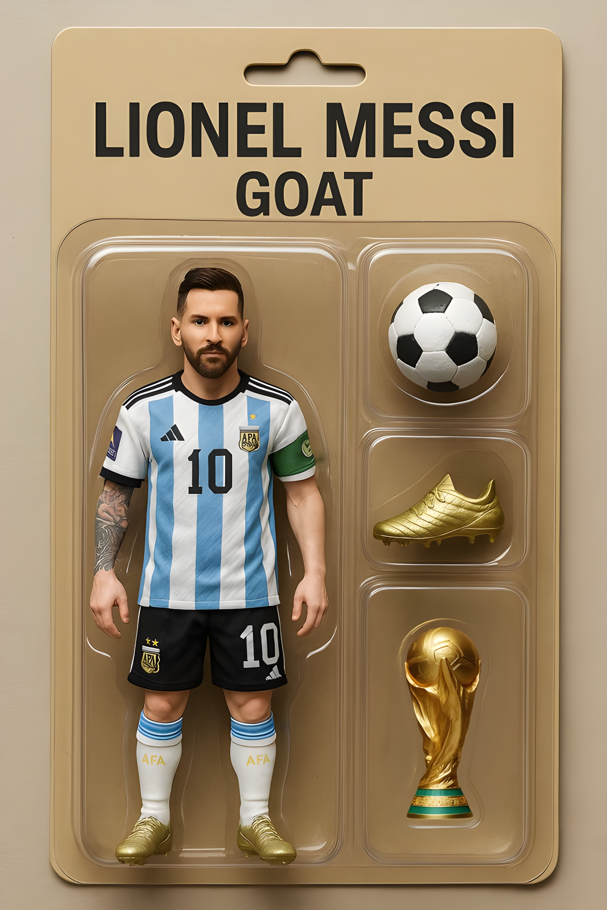 CopyCreate a toy of the person in the photo. Let it be an action figure. Next to the figure, there should be the toy's equipment like a football and football boot and world cup. Also, on top of the box, write 'LIONEL MESSI and underneath it, 'GOAT'.Visualize this in a realistic way.