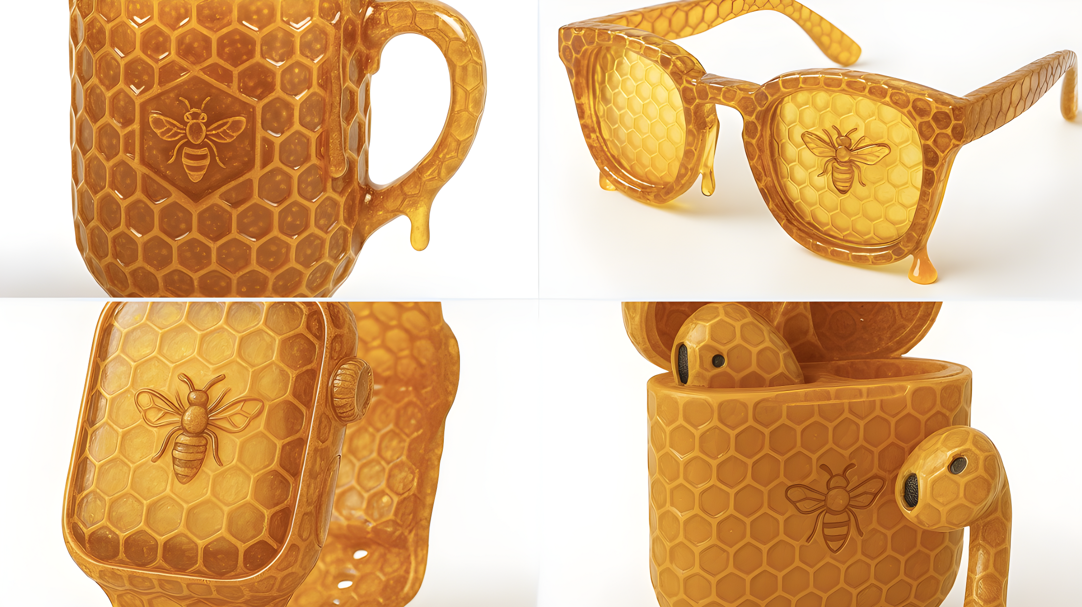 Copy[Object] OBJECT_NAME. [Style] Transparent Honeycomb Transformation. [Description] Transform the object into a structure made entirely of crystallized golden honey with high transparency. The surface should be ultra-glossy, semi-liquid, and light-reflective, with defined yet see-through hexagonal honeycomb patterns. Parts of the object should allow light to pass through, revealing inner layers and structure. Include gentle honey drips for realism.. [Material] Primary: Crystal-clear amber honey. Secondary: Translucent honeycomb cells. [Texture] Surface: Ultra glossy and semi-liquid. Pattern: See-through hexagonal honeycomb. Drips: true. [Effects] Translucency: highly translucent. Internal Glow: Soft warm light from within. Emblem: Delicate bee icon subtly embedded in the structure. [Presentation] Background: Clean white or soft gradient. Lighting: Backlit with soft diffusion to enhance translucency. Floating: true. Format: Square.