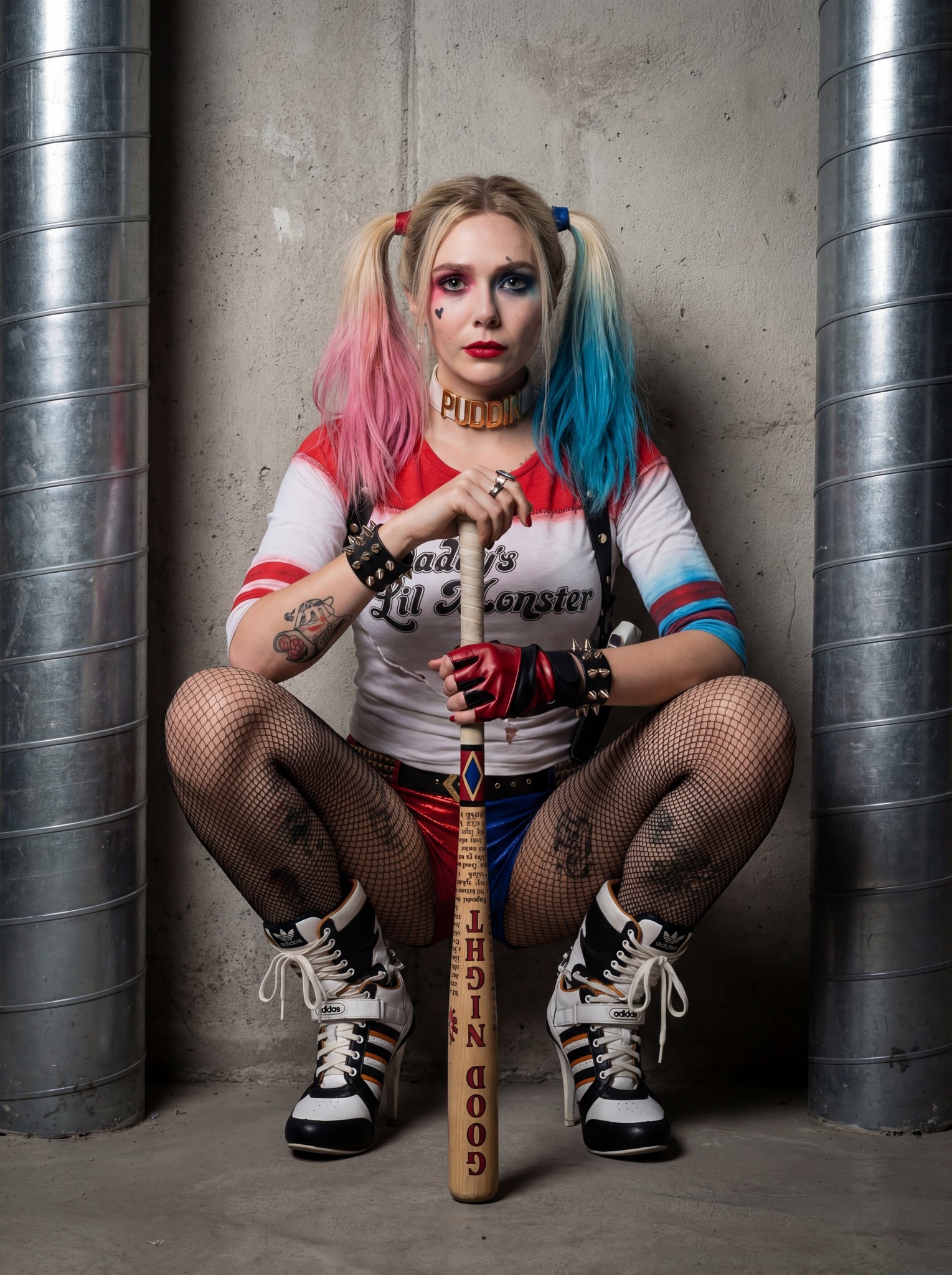 Copy{ "subject": { "character": "Harley Quinn cosplay", "hair": "Blonde pigtails, one side dipped pink, the other blue", "makeup": "Heavy eye makeup, red lipstick, small heart tattoo on cheek", "accessories": ["Gold PUDDIN choker", "Red and black glove on right hand", "Studded bracelets", "Rings"] }, "clothing": { "top": "White t-shirt with red neckline and stripes, tied at the front, with black text Daddy's Lil Monster", "bottoms": "Shiny red and blue hot pants", "belt": "Black studded belt with gold buckle", "stockings": "Black fishnet stockings", "leg_tattoos": "Visible tattoos on thighs underneath fishnets" }, "props": { "item": "Baseball bat held between legs" }, "pose": "Crouching against a concrete wall, holding a bat, looking directly at the camera, head tilted", "environment": { "background": "Rough concrete wall with two large corrugated metal ventilation pipes on either side", "lighting": "Soft, even indoor lighting", "context": "Industrial or urban setting", "quality": "high-quality, cinematic, ultra-realistic photo and lighting, depth of field" } }