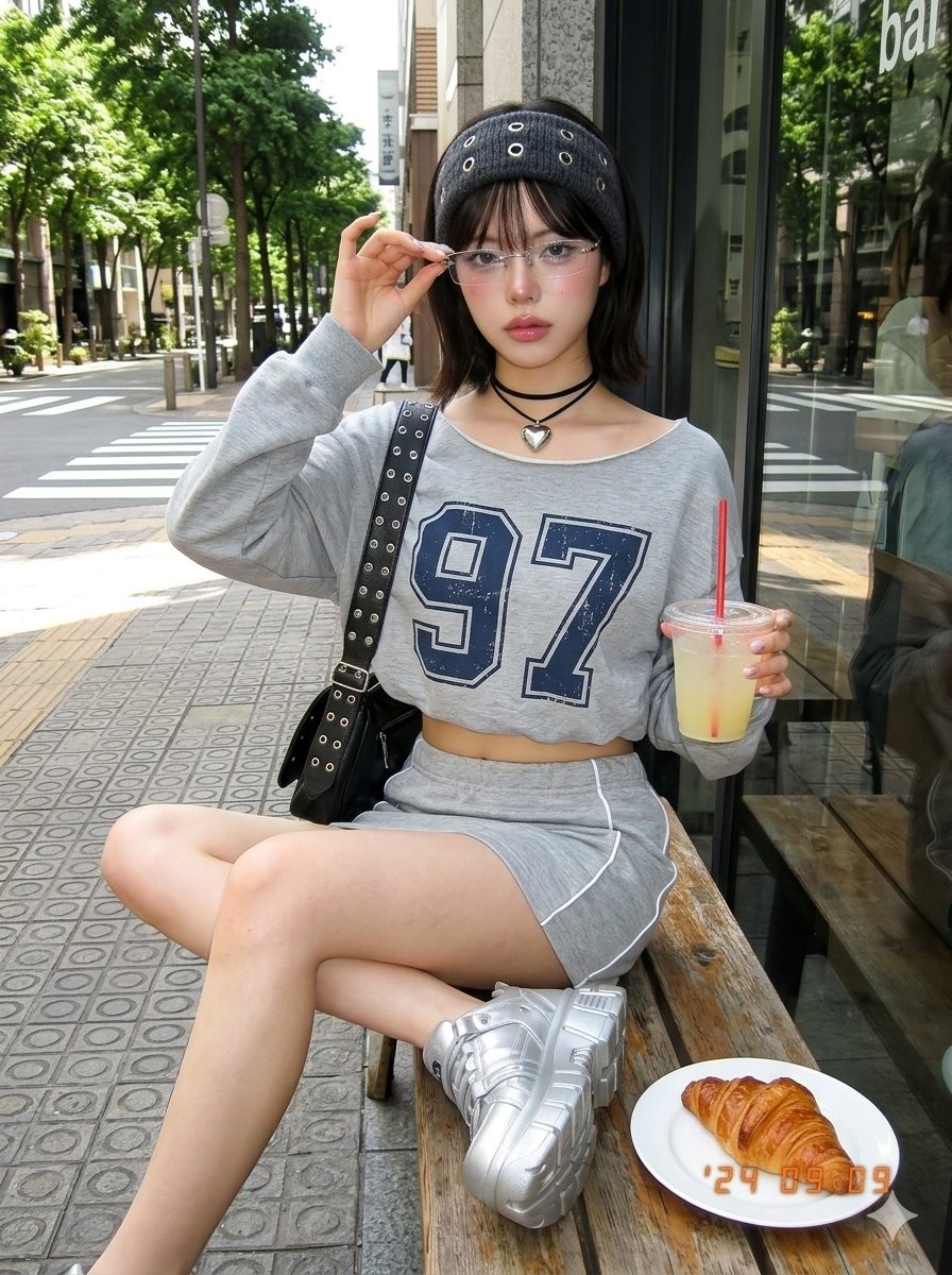 CopyCreate image: Use the attached reference image as a visual guide for the character's appearance. Maintain visual consistency in facial structure and overall proportions, while allowing for natural variations typical of real photography. The generated subject should resemble the reference while appearing as a natural photographic interpretation. A hyper-realistic photograph in the style of an authentic early 2000s digital photo, captured with a harsh direct flash that creates sharp shadows and a distinctive bloom effect on reflective surfaces. The subject is positioned on a rustic wooden bench outside a city cafe, framed in a medium shot from a slightly low angle. The subject sits with the right leg sharply bent, the foot of a chunky, oversized silver platform sneaker resting on the bench's surface, while the other leg extends down toward the grey stone-tiled sidewalk. One arm is raised with digits delicately touching the frame of rimless rectangular glasses, while the other hand holds a plastic takeaway cup filled with a light yellow liquid and a red straw. The attire features a grey cropped sweatshirt with a wide boat neck and a distressed navy blue "97" collegiate graphic, paired with a matching grey mini skirt accented by white piping. Accessories include a thick charcoal knit headband with metallic silver grommet detailing, a black choker with a silver heart pendant, and a black leather bag with a wide, silver-studded shoulder strap. On the bench sits a white ceramic plate with a flaky, golden-brown croissant. The background depicts a sunlit urban street with leafy green trees, a pedestrian crossing, and the reflection of city architecture in a large glass storefront. The makeup look is characterized by shimmery, opalescent eyeshadow across the lids and subtle pink blush dusting the cheekbones and nose, finished with a soft, glossy gradient-pink lip color. The final image has the high-contrast, slightly over-saturated look of a vintage point-and-shoot camera, complete with a small orange digital timestamp in the bottom right corner. Aspect Ratio: 3:4 Negative: unnatural limbs, distorted hands, incorrect finger count, fused features, dislocated joints, unnatural pose, twisted body, duplicated parts, unrealistic anatomy, warped proportions, ai artifacts, poorly rendered details