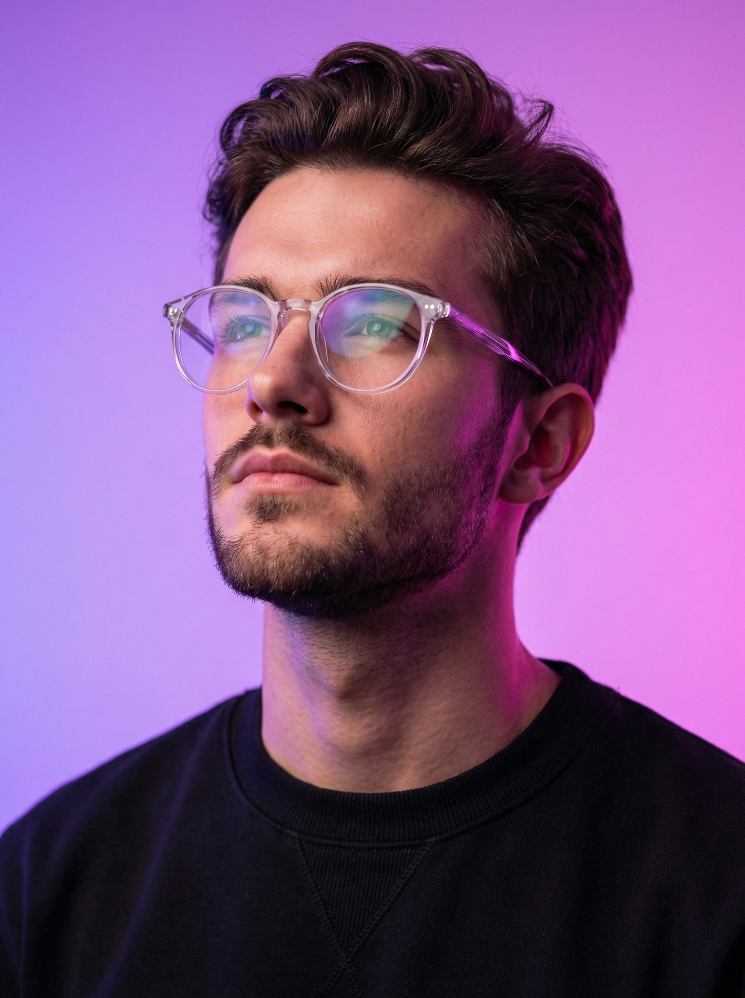 CopyUltra-realistic modern portrait of a man wearing transparent frame glasses and a black sweatshirt, looking slightly upward. Neon purple and pink gradient background lighting reflecting softly on glasses. Clean studio setup, cyber-modern aesthetic, soft rim lighting, sharp focus, 50mm lens, high detail, vibrant color grading.