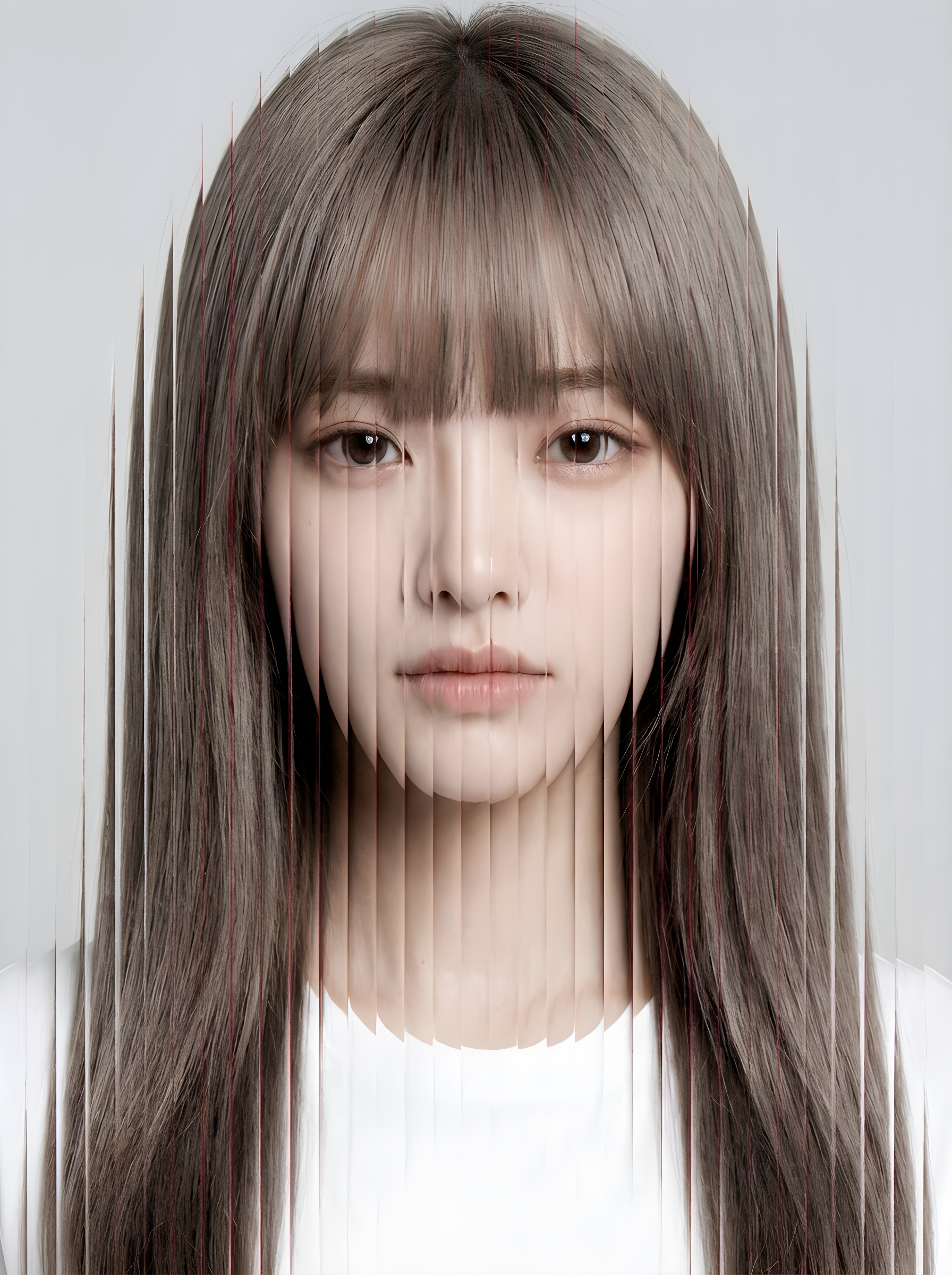 Copy[Style] Name: vertical_slice_glitch. Description: High-fashion portrait with vertical slice distortion, glitch splitting, and analog-style grain.. Elements: [Subject] Type: fashion_portrait. Framing: tight_face_centered. Expression: neutral_or_intense. Lighting: soft_diffused_studio. Skin Texture: realistic_with_blush. Wardrobe: minimal_solid_colors. [Distortion] Effect: vertical_slit_scan. Slice Count: 40-80. Slice Thickness: thin. Displacement Amount: medium. Alignment: center_weighted. Smooth Blend Edges: false. Random Offset: true. Direction: vertical. [Texture] Grain: medium_heavy. Noise: fine_digital_noise. Compression Artifacts: subtle. Film: matte_fashion_editorial. [Color Palette] Background: #F2F2F2. Tones: muted_neutral. Accent: deep_red. Contrast: medium_high. [Camera] Lens: 85mm_portrait. Depth Of Field: shallow. Focus: eyes. Angle: straight_on.. [Output] Format: high_fashion_glitch_portrait. Aspect Ratio: 3:4. Resolution: high.