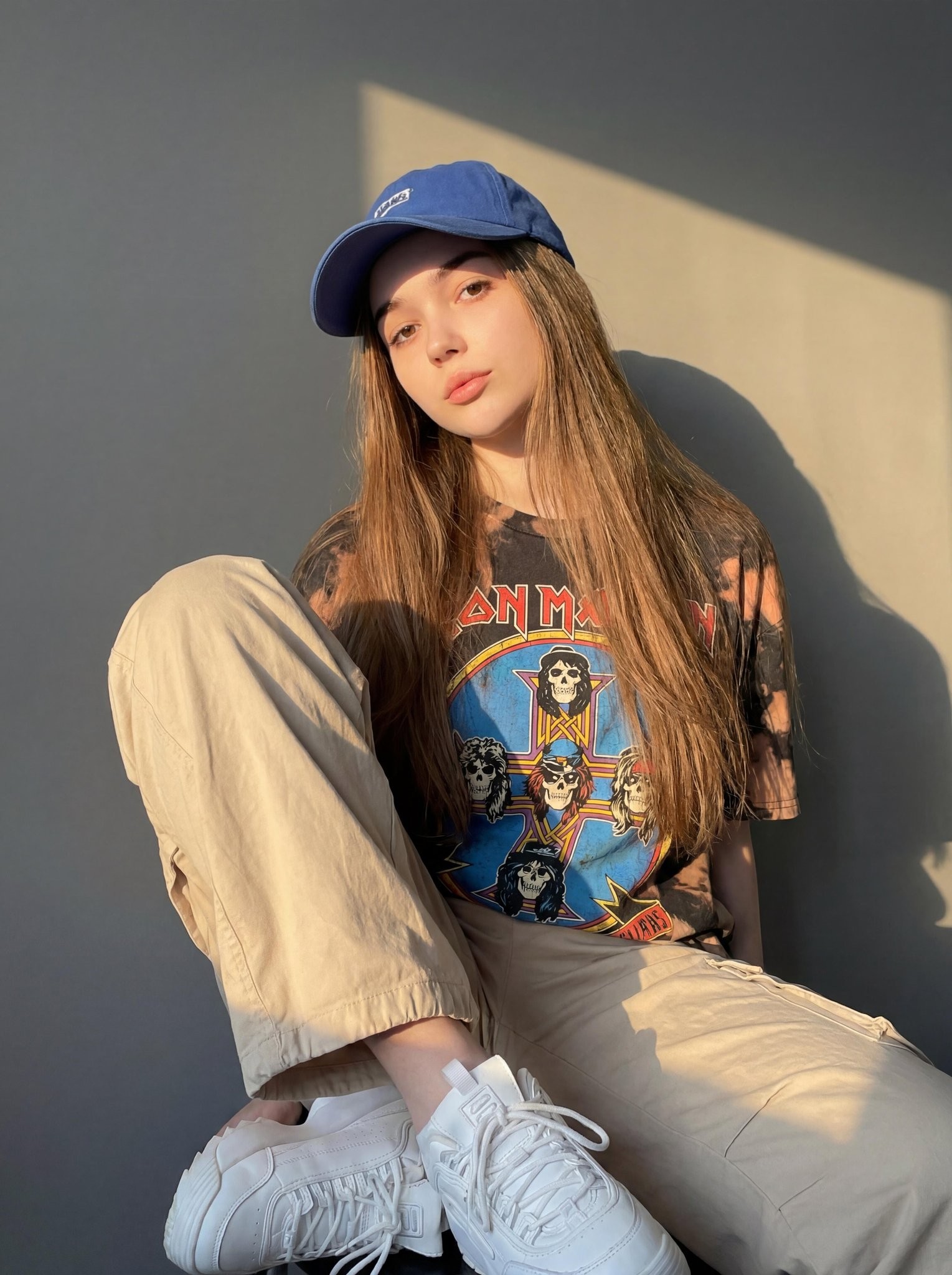 CopyA girl wearing a casual streetwear outfit, featuring a bold graphic t-shirt with eye-catching design, a stylish blue cap, relaxed-fit beige pants, and clean white sneakers, laid-back confident pose with natural body language, effortless street style vibe, soft facial expression with a hint of attitude, modern urban environment such as a city street or sidewalk with subtle background elements, natural daylight creating soft shadows and realistic highlights, balanced composition with subject in focus and slightly blurred background, high detail textures in clothing and fabric, realistic skin tones, contemporary fashion photography style, vibrant yet natural color palette, minimal accessories, candid lifestyle aesthetic, ultra realistic, sharp focus, cinematic feel.