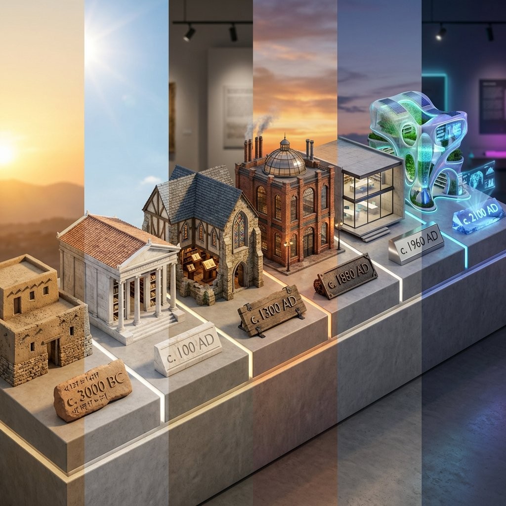 CopyGenerate a hyper-realistic, 3D "Timeline Diorama" visualizing the evolution of libraries. Generate exactly 6 distinct structures. Divide human history (5000 BC to 2100 AD) into 6 equal milestones: Ancient → Classical → Gothic → Industrial → Modernist → Future. For each era, identify the most iconic architectural style for libraries. The Platform: A long, continuous Museum Display Plinth (Marble or Concrete) extending diagonally into the distance. Subtle "fissures" or light strips in the floor separate the eras. Construct each building using materials strictly available in that time period: Ancient (Mud, Thatch, Rough Stone), Classical/Medieval (Marble, Wood beams, Stained Glass), Industrial (Red Brick, Iron, Soot), Modern (Concrete, Steel, Plate Glass), Future (Bioplastic, Aerogel, Holograms, Greenery). In front of each building, place a Physical 3D Date Label made of the era's dominant material. Camera: Isometric or High-Angle Diagonal. Scale: 1:100 Architectural Model style. Atmosphere: The lighting evolves across the image (Sunrise on the left → Noon → Sunset → Neon Night on the right). Ultra-Wide Aspect Ratio 21:9, Architectural Render, Museum Lighting.