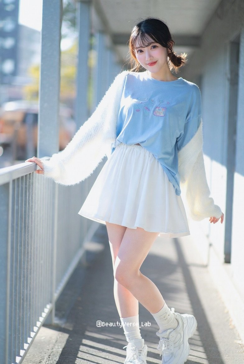 CopyJapanese young beautiful woman, soft natural light makeup, clear smooth skin, subtle blush, natural pink lips, gentle sweet smile, bright expressive eyes dark brown medium length hair tied into low side ponytail, soft bangs, natural hair shine wearing a cute streetwear outfit in sky blue and white: oversized pastel sky blue graphic T-shirt with subtle kawaii or simple prints, layered with a soft white fluffy cropped knit cardigan, paired with a flowy white pleated mini skirt, white crew socks with cute details, chunky white platform sneakers standing in outdoor corridor, holding railing with one hand, relaxed playful pose, legs slightly crossed Bright natural sunlight, strong contrast, shallow depth of field, photorealistic fashion photography style, 85mm lens, f/2, ultra high resolution.