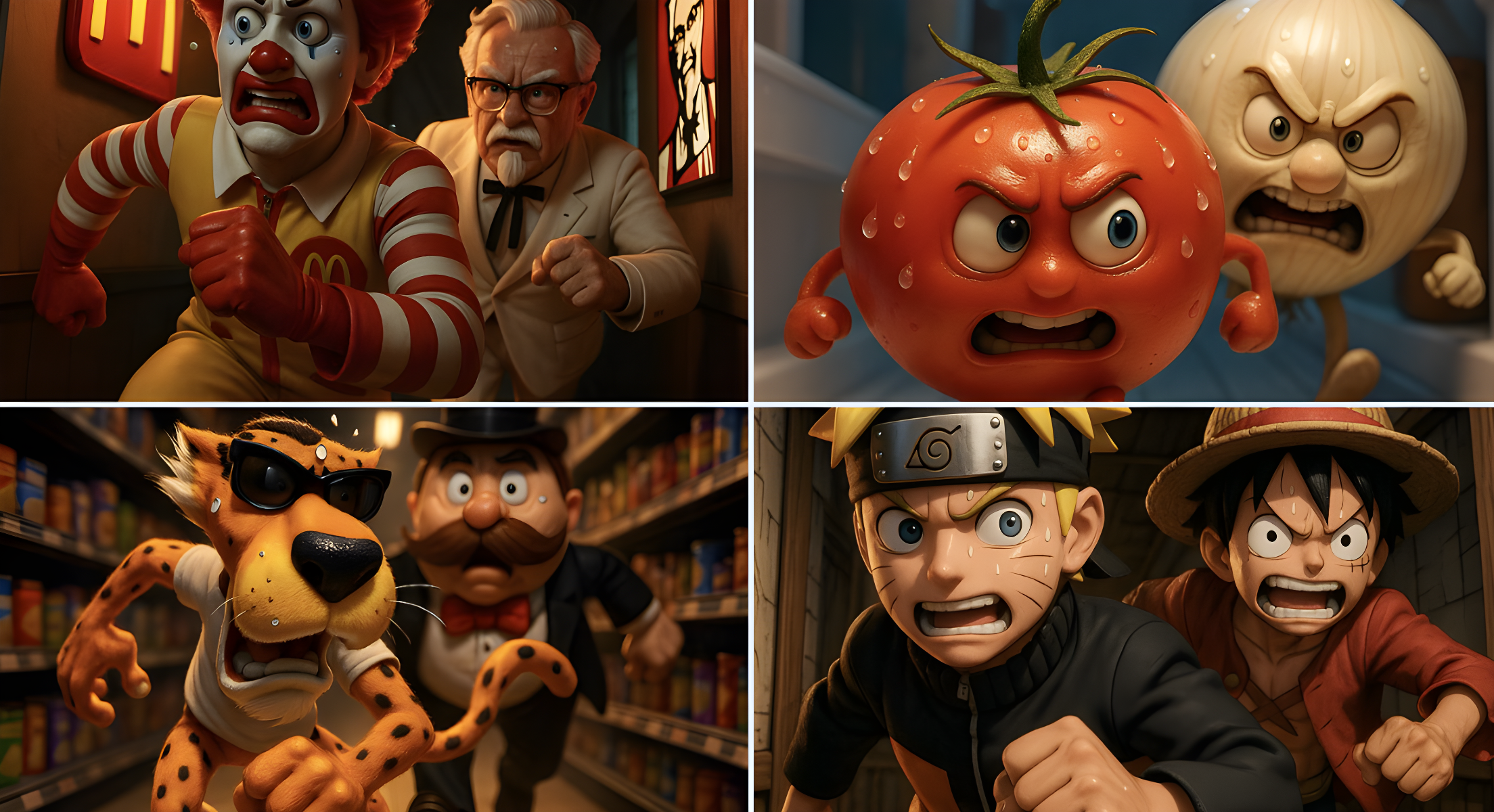 CopyA thrilling 3D cartoon scene: [CHARACTER1] runs through a narrow corridor inside [Place], chased at high speed by [CHARACTER2]. Their facial expressions reflect tension and focus, with beads of sweat glistening under dramatic lighting.