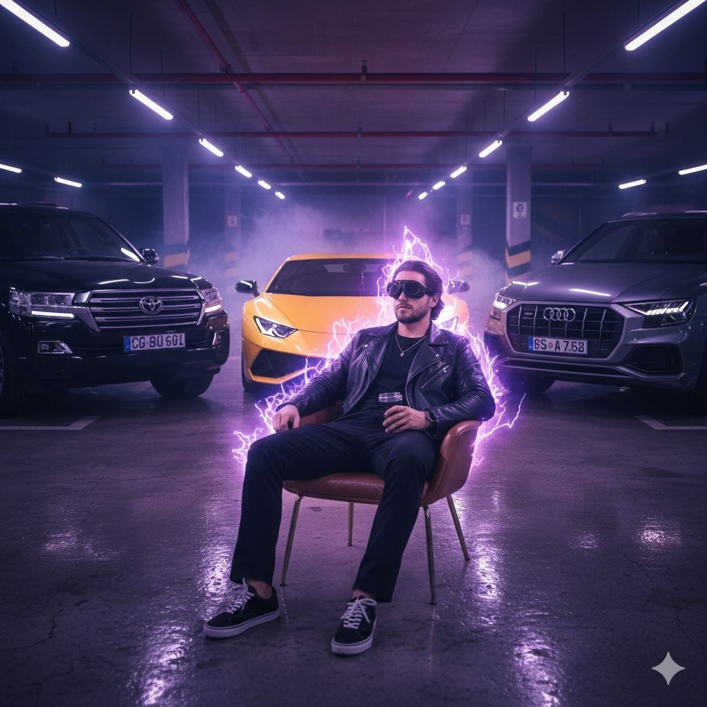 CopyA stylish man sitting on a chair in a neon-lit luxury parking space at night, holding a glass coffee cup. He wears a premium black leather jacket over a dark tee, black parallel pants, and black & white sneakers. Black goggles, light beard, slightly long hair moving softly in the air. Behind him: LAND CRUISER, Lamborghini, And Audi Q8 reflecting purple and blue neon lights on a wet floor surface. Glowing aura energy around the man, cyberpunk lighting, mist atmosphere, cinematic reflections, ultra-detailed, high contrast, futuristic luxury mood.