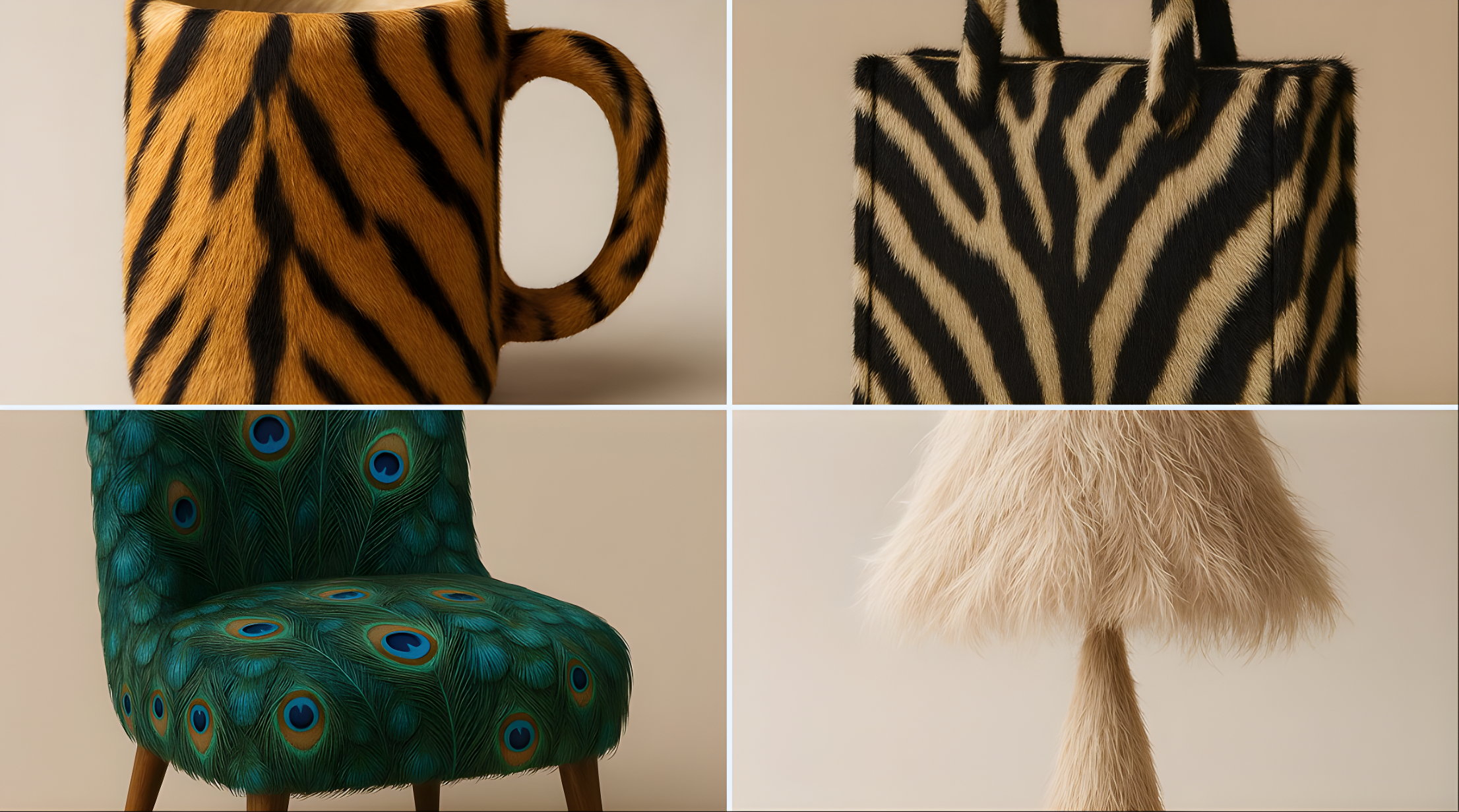 CopyA high-quality studio photograph of a [OBJECT] fully covered in ultra-realistic [ANIMAL] texture (e.g., fur, feathers, skin, or scales), placed against a soft neutral background. The object’s original form remains visible but is wrapped in the animal’s natural pattern and surface detail. The image features clean composition, soft shadows, sharp focus, minimalist styling, professional lighting, and highly detailed textures—each hair, feather, or wrinkle should be visible. Format 1:1.